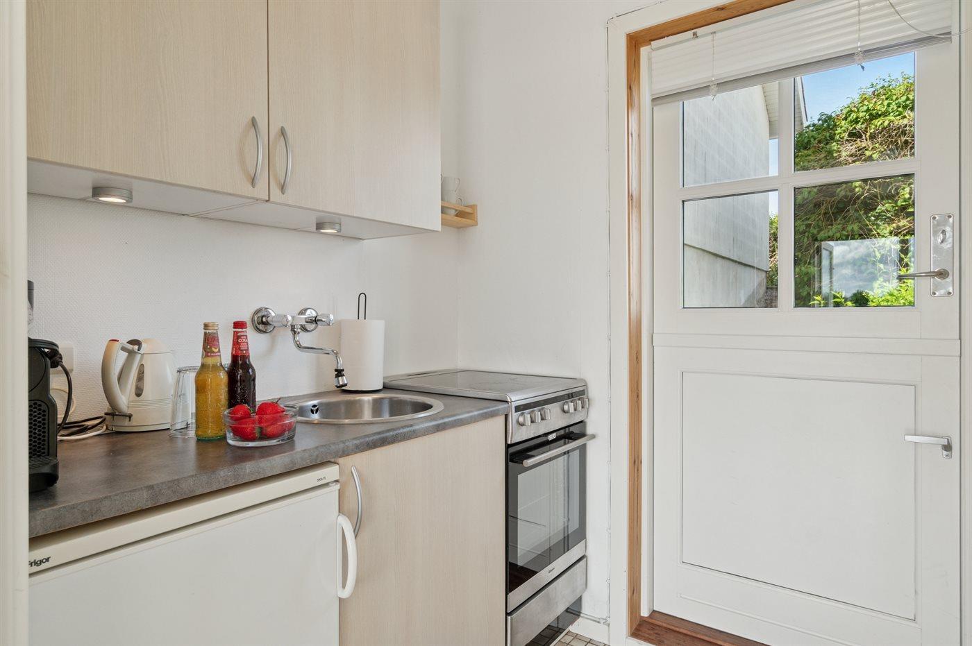 Køkkenet er udstyret med 1 køleskab. Der er 4 keramiske kogeplader, varmluftovn.