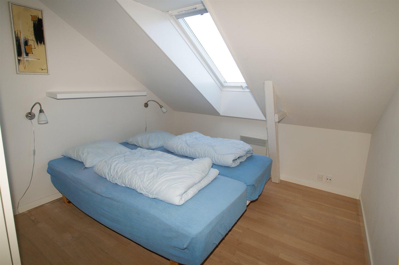 Lejlighedens sovepladser fordeler sig på 2 værelser med dobbeltseng, hvoraf det ene er et gennemgangsværelse (se grundplan). Badeværelse med gulvvarme og glasbruseniche.