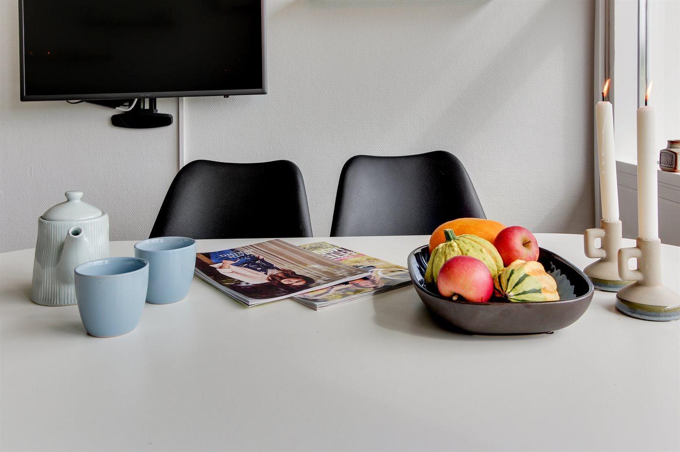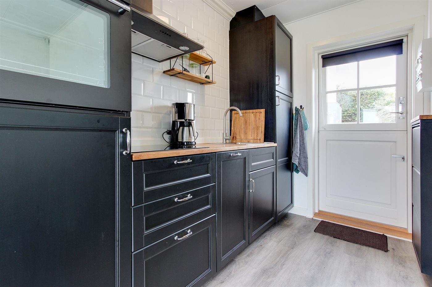 Køkkenet er udstyret med 1 køleskab. Der er 4 keramiske kogeplader, varmluftovn, mikrobølgeovn samt opvaskemaskine.