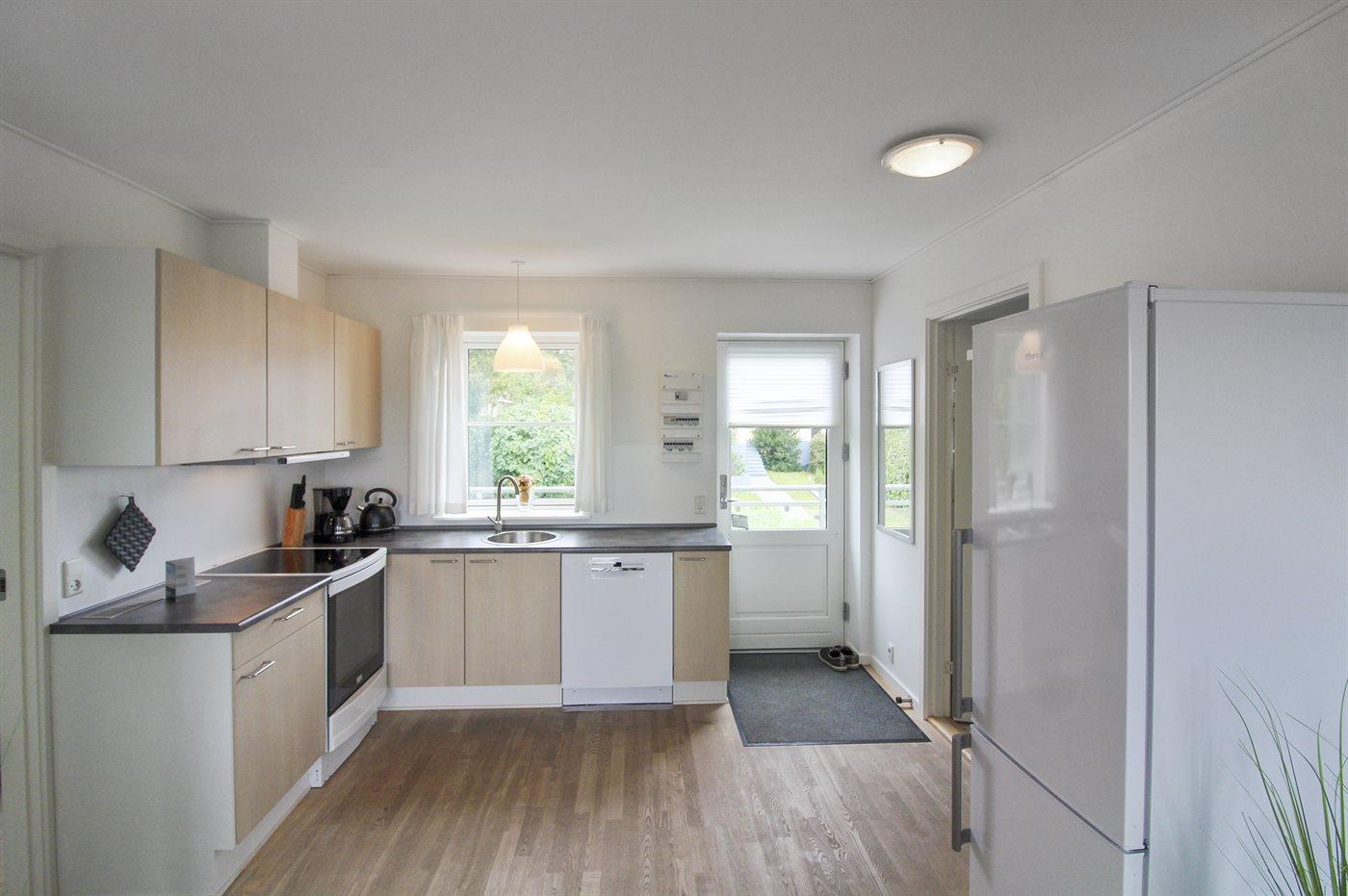 Køkkenet er udstyret med 1 køleskab. Der er 4 induktionskogeplader, varmluftovn samt opvaskemaskine.