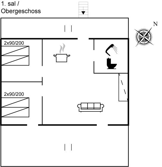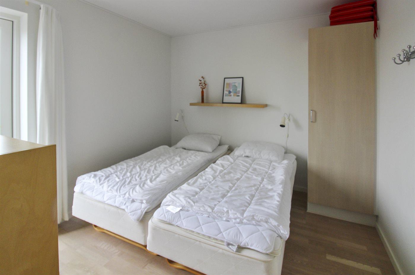 Der er i alt 2 soveværelser. Sovepladserne fordeler sig på: 4 sovepladser i dobbeltsenge. 1 soveplads i sovesofa (enkelt). 1 af disse sovepladser befinder sig i stuen.