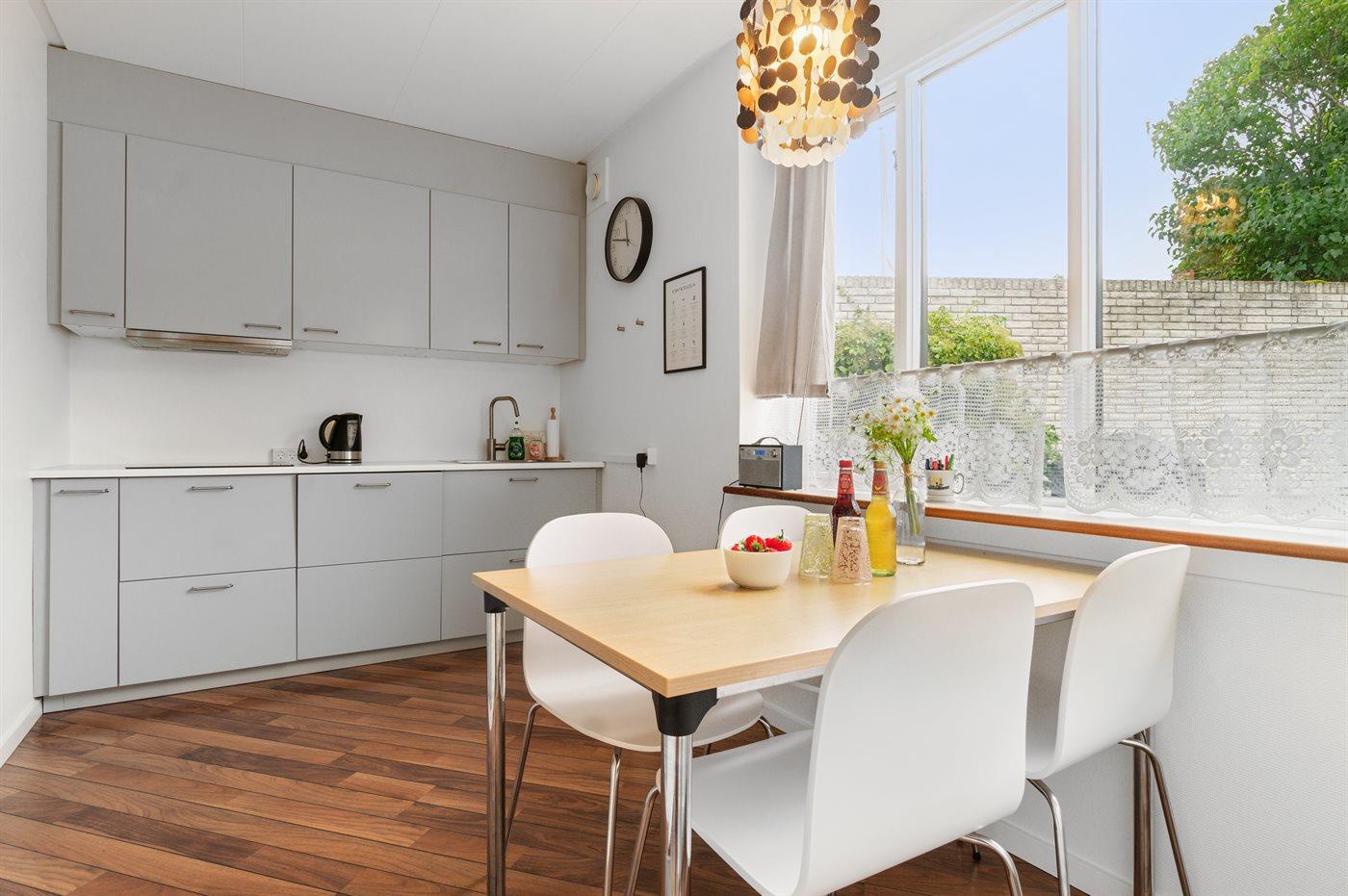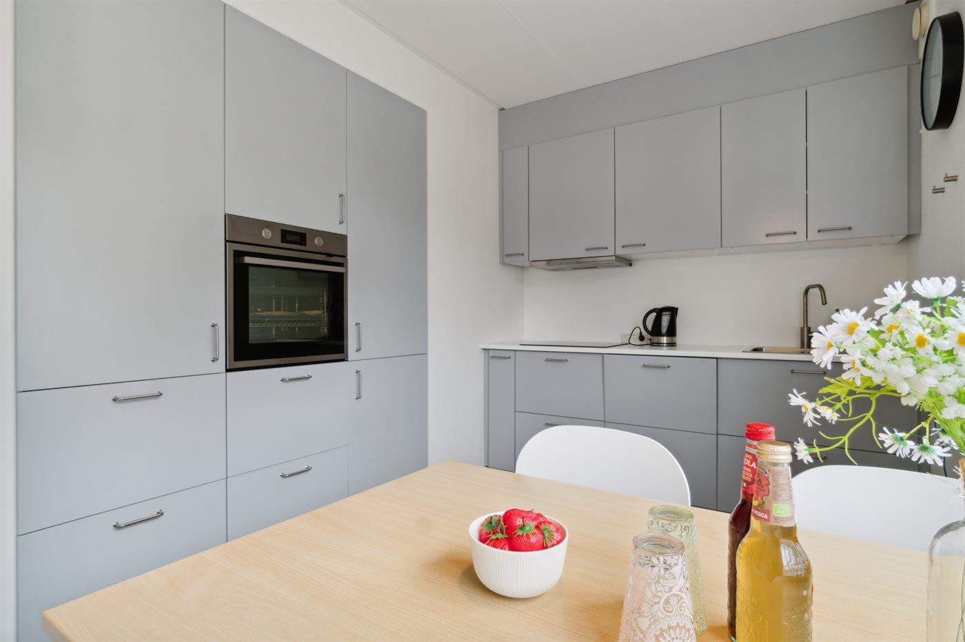 Køkkenet er udstyret med 1 køleskab. Der er 4 induktionskogeplader, varmluftovn samt opvaskemaskine.