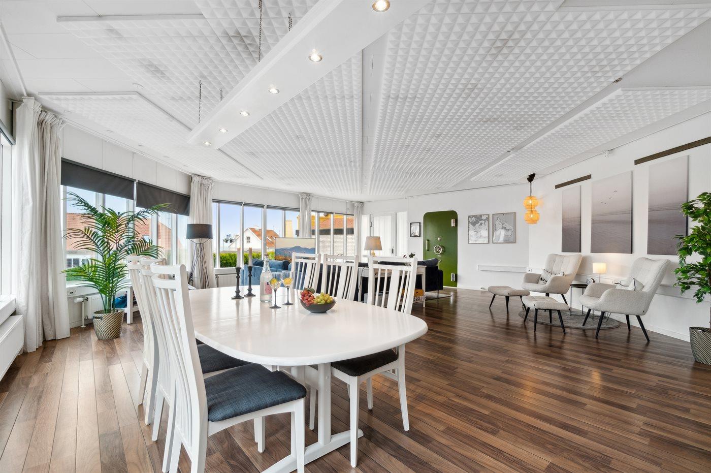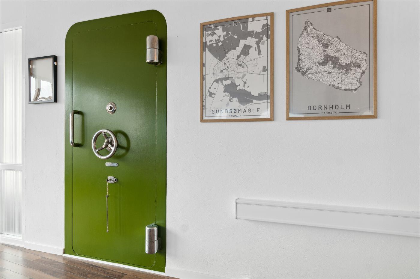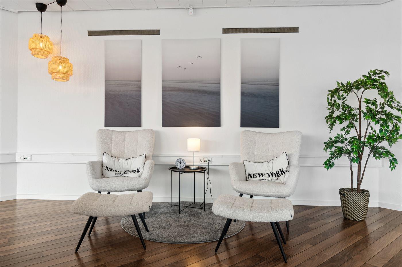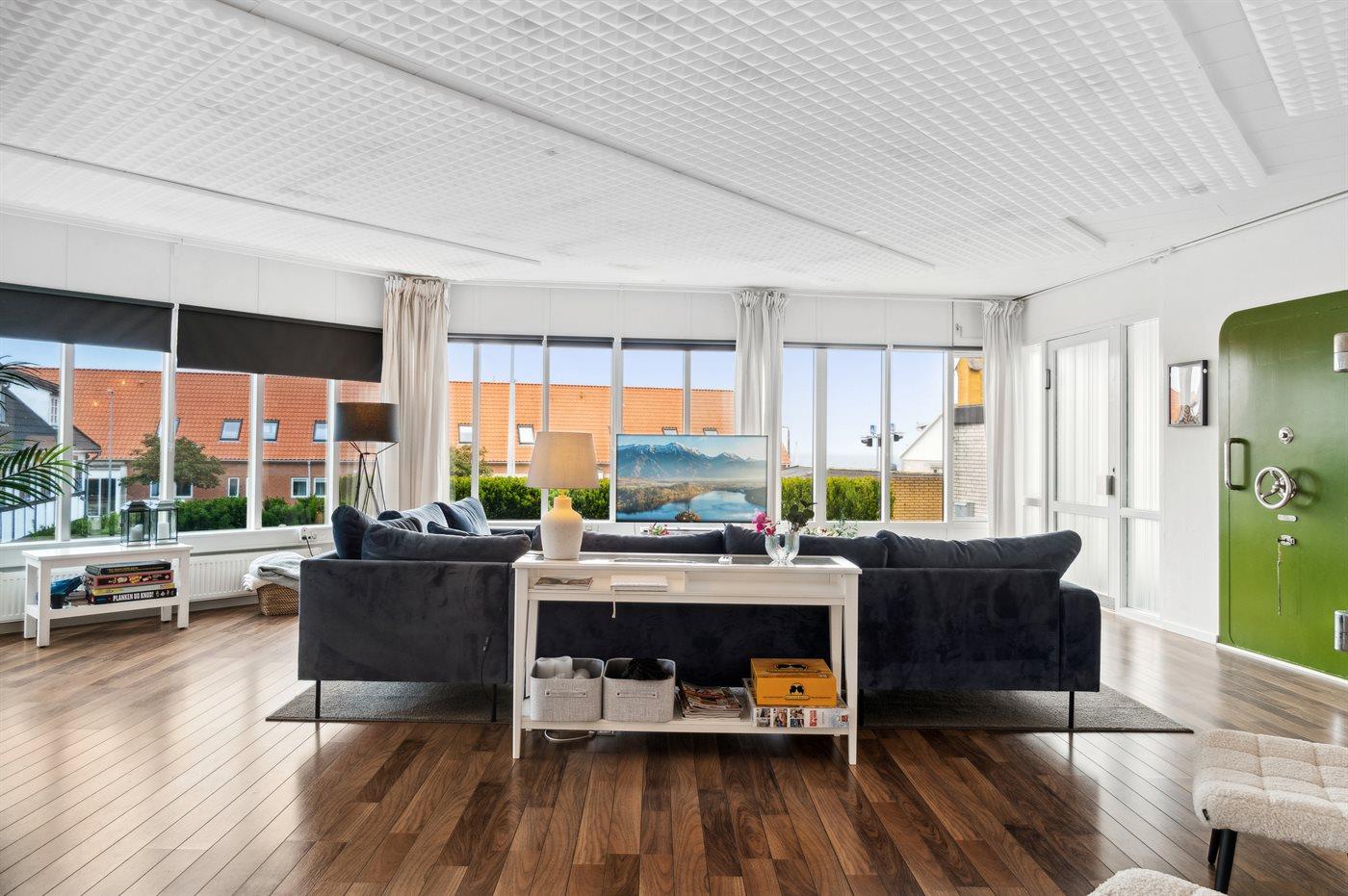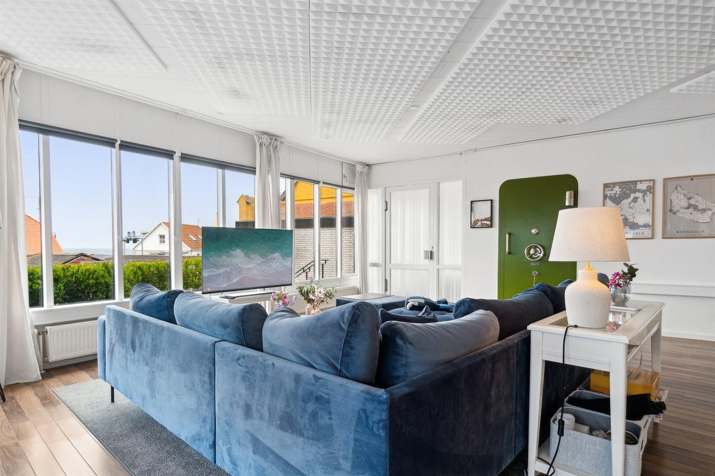 En velindrettet ferielejlighed i rigtig god kvalitet med en stor stue, der indbyder til hygge og samvær. Lejligheden er beliggende i den lille by Tejn, i en bygning, hvor der tidligere har været en bank.