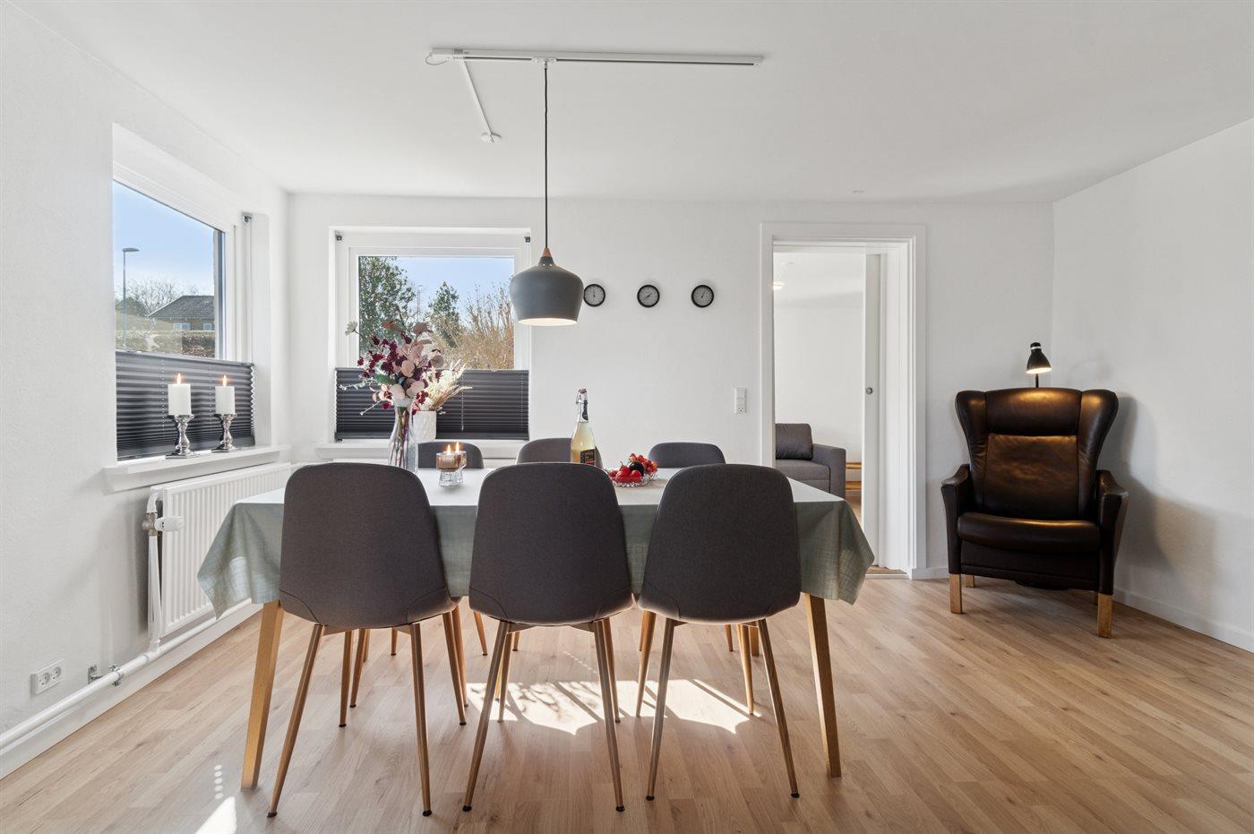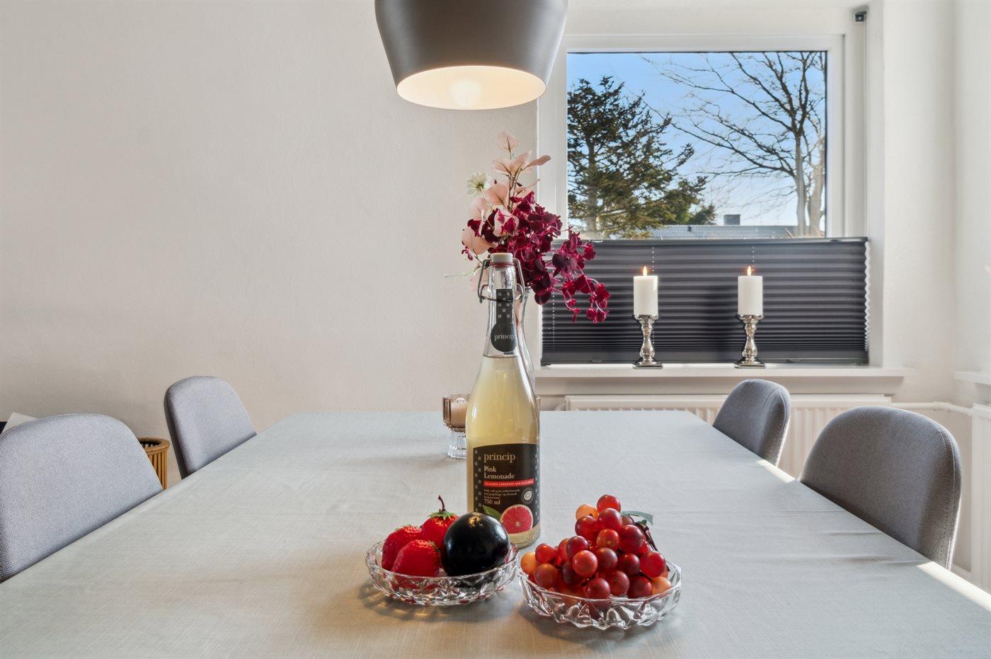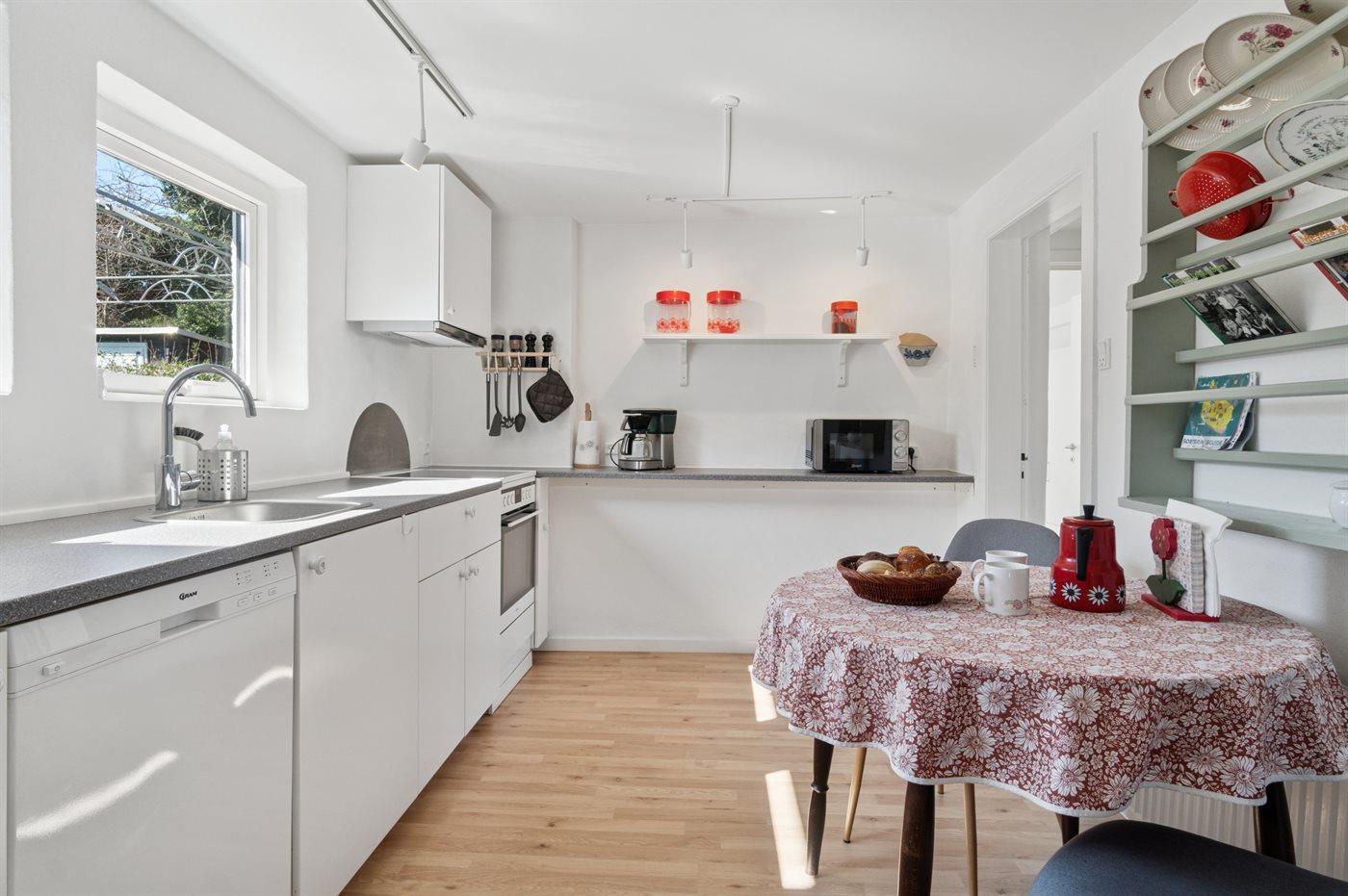 Køkkenet er udstyret med 1 køleskab. Der er 4 keramiske kogeplader, varmluftovn, mikrobølgeovn samt opvaskemaskine.