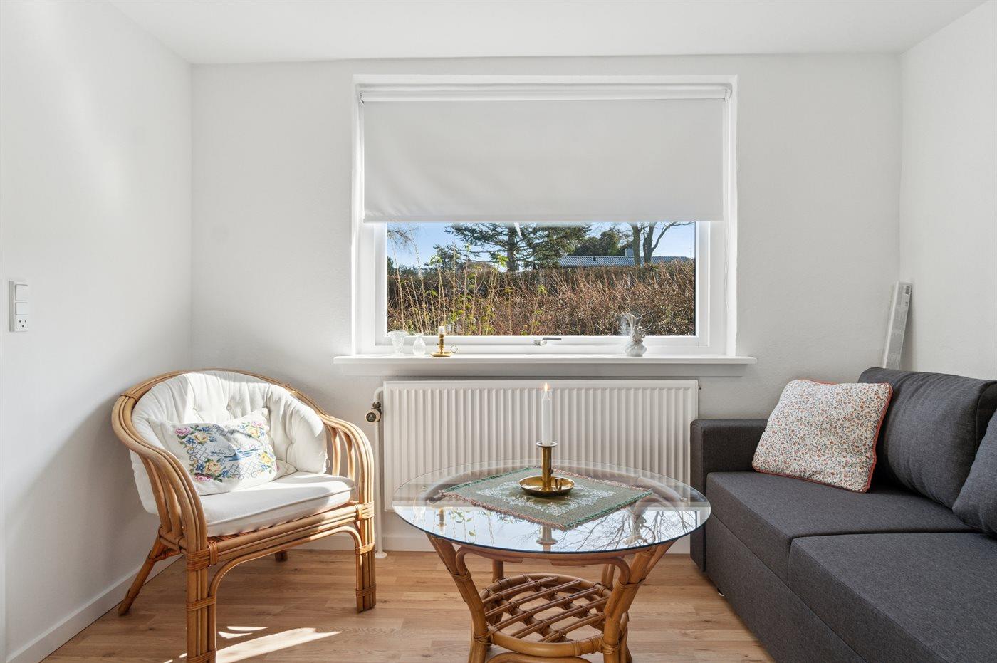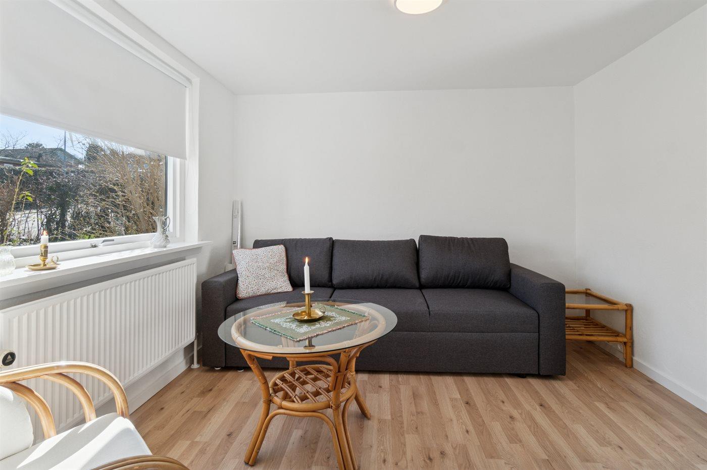Stuen er husets største rum og her er der er god plads til hygge med familien – ønsker du derimod lidt mere fred og ro, så kan du sætte dig ud i udestuen for at læse en bog, strikke eller bare slappe af. Køkkenafdelingen fremstår moderne og der er god plads til kokkerere. Huset har to soveværelser og der findes en sovesofa i udestuen. Desuden er der et pænt og indbydende badeværelse.