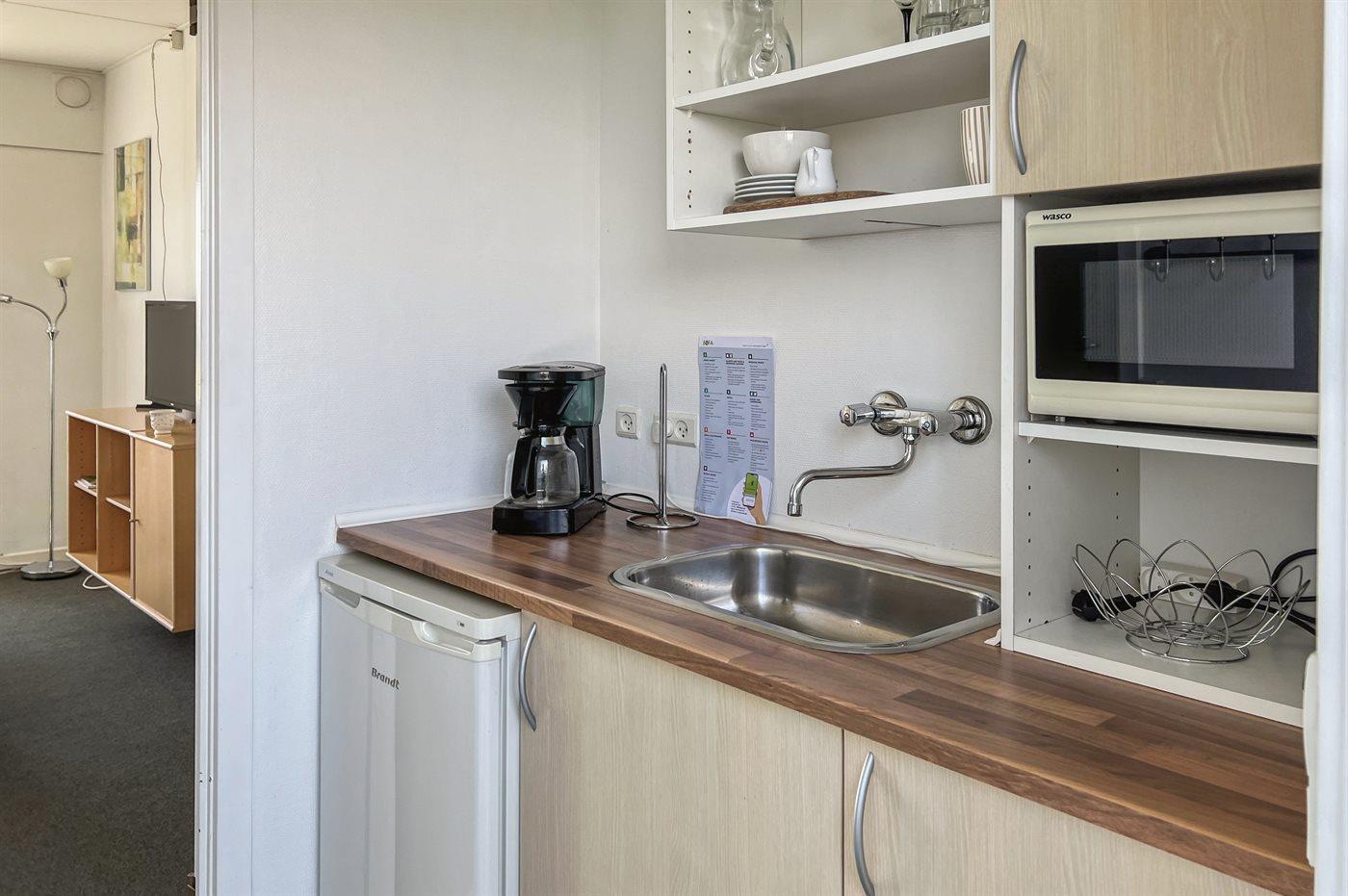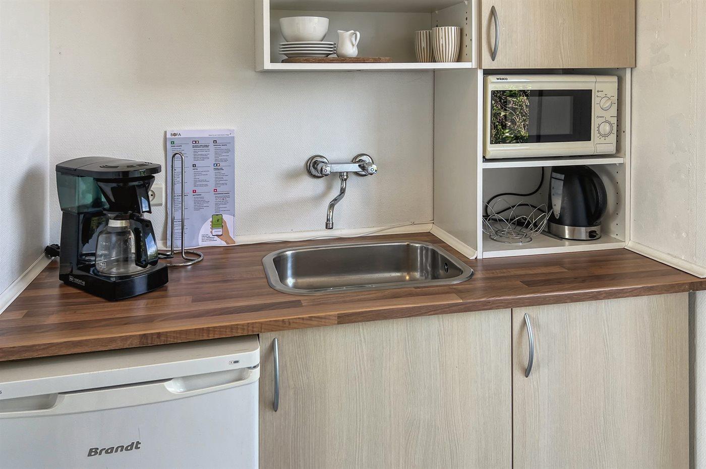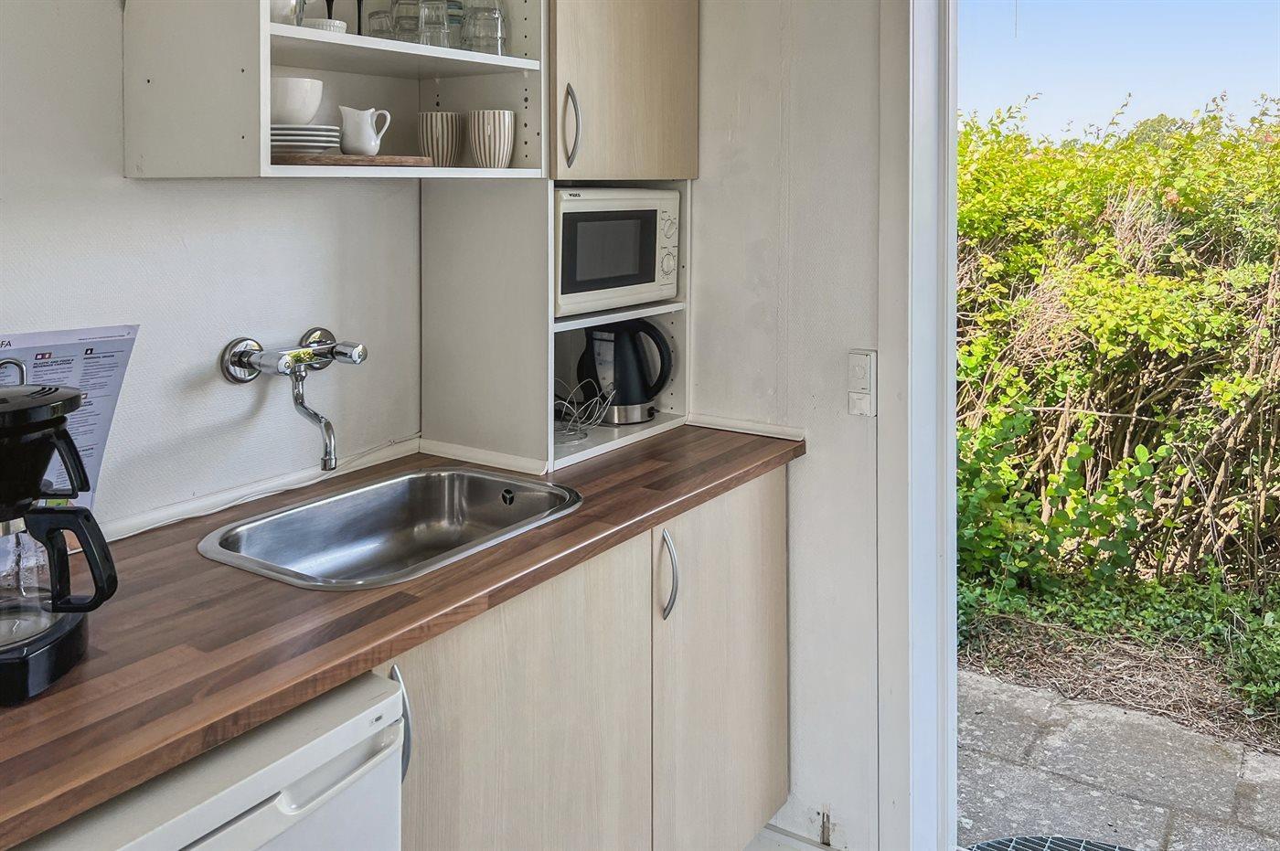 Køkkenet er udstyret med 1 køleskab. Der er 2 elkogeplader, miniovn.