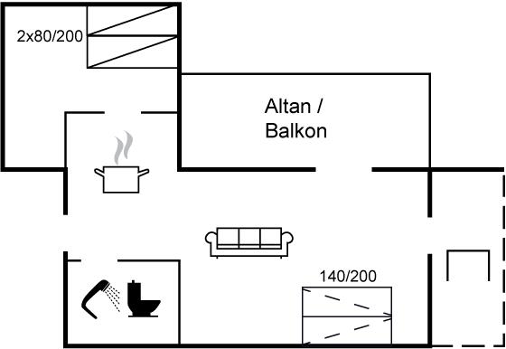 Der er i alt 1 soveværelse. Sovepladserne fordeler sig på: 2 sovepladser i dobbeltseng. 2 sovepladser i sovesofa (dobbelt). 2 af disse sovepladser befinder sig i stuen.