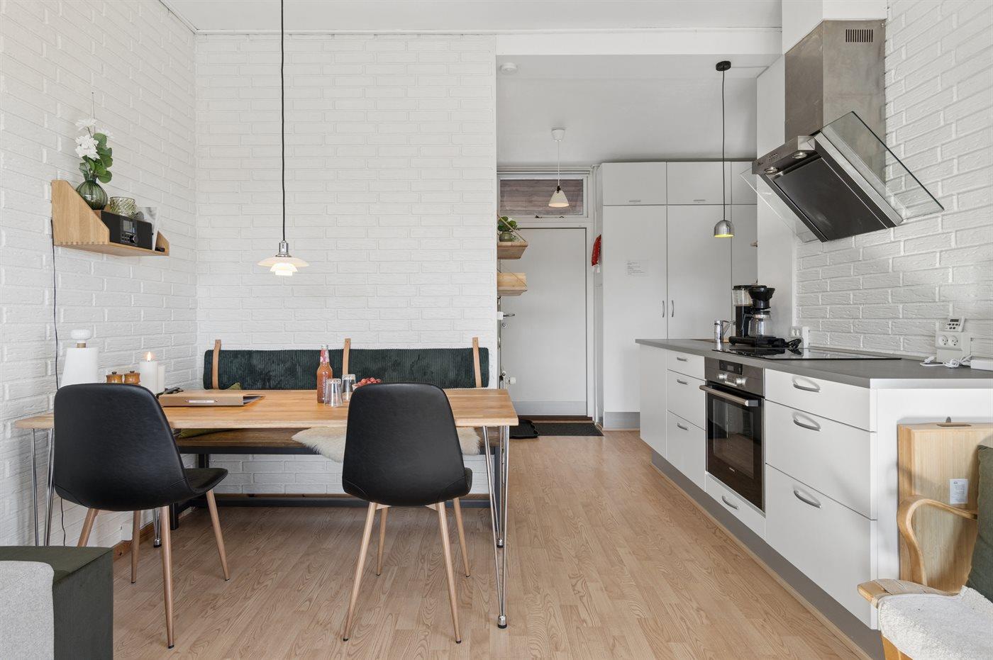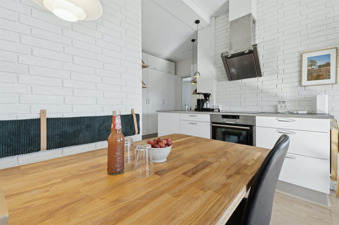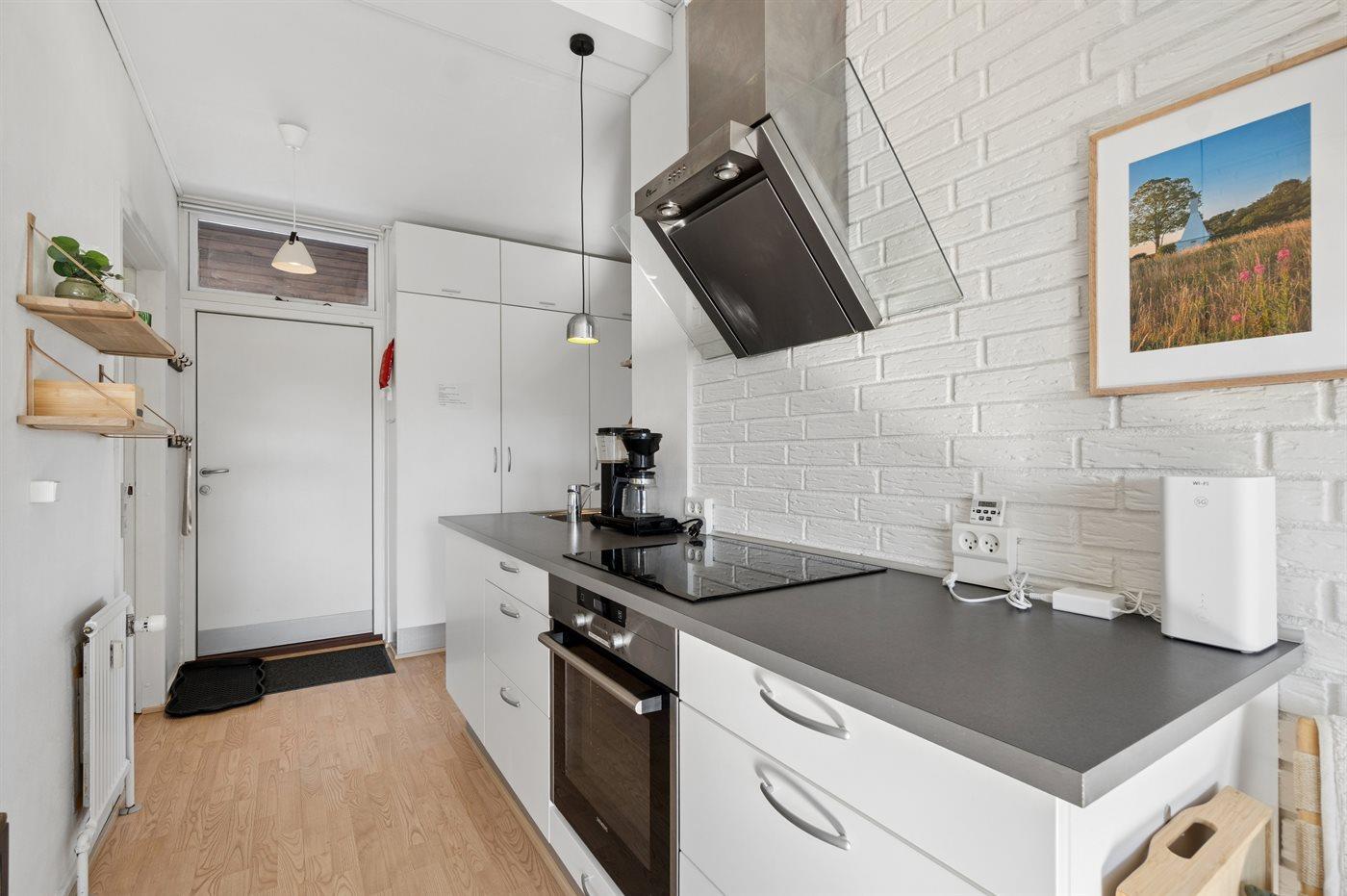 Køkkenet er udstyret med 1 køleskab. Der er 4 keramiske kogeplader, varmluftovn.