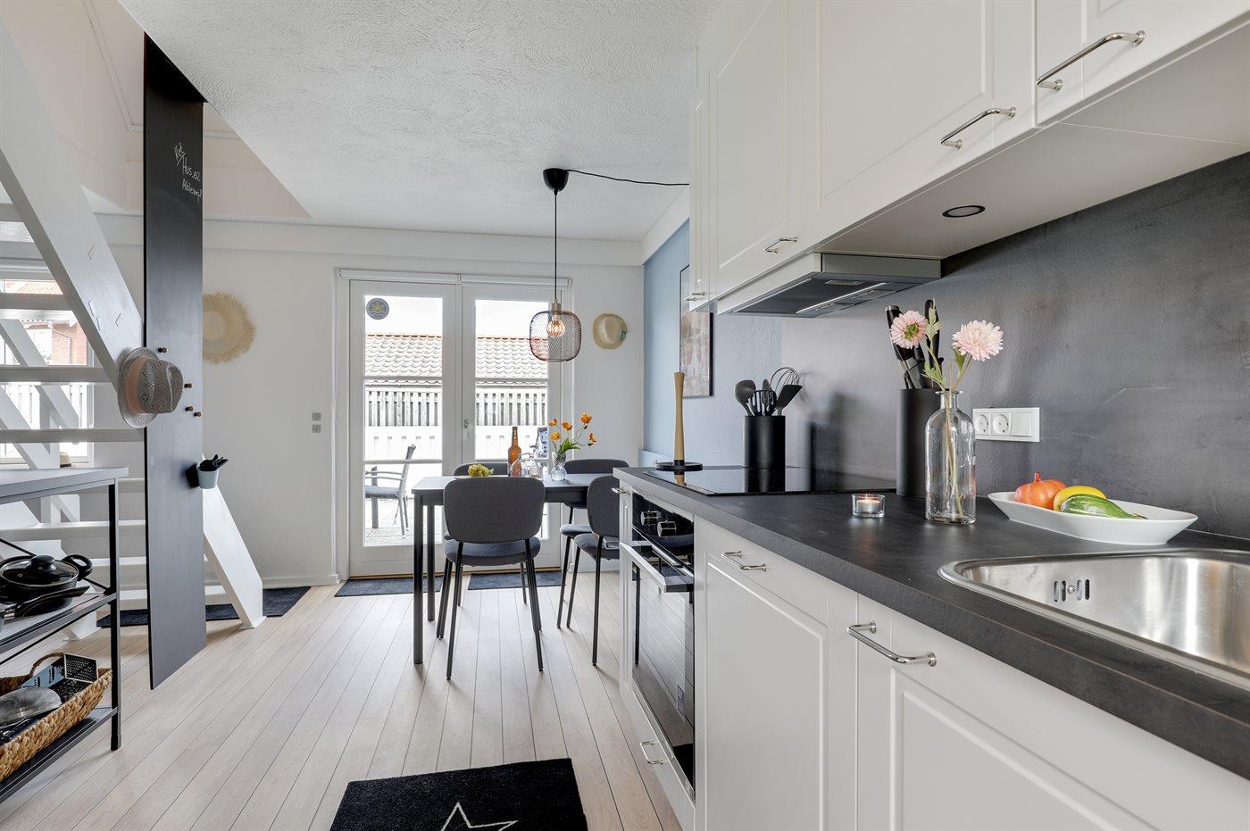 Køkkenet er udstyret med 1 køleskab. Der er 4 induktionskogeplader, varmluftovn, mikrobølgeovn samt opvaskemaskine.