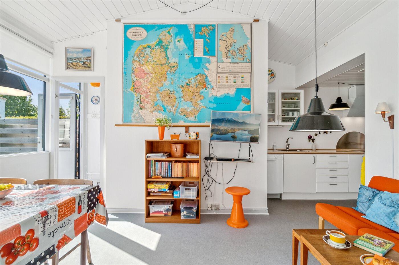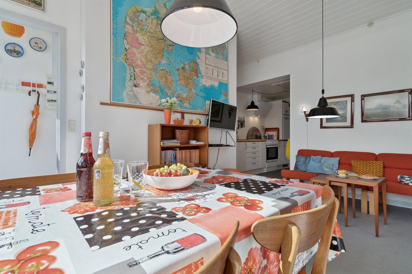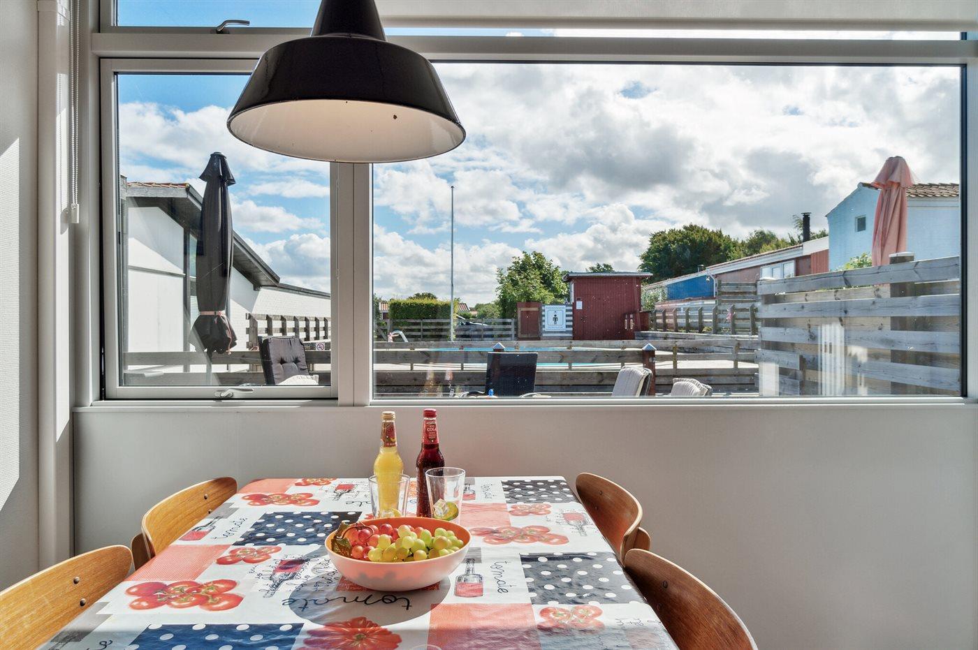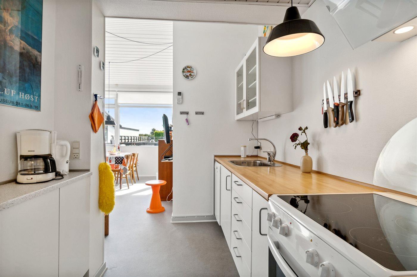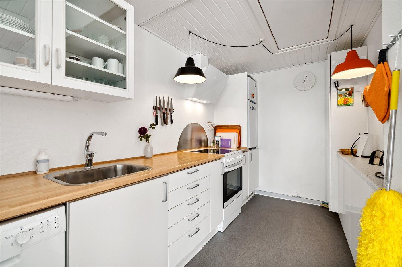 Køkkenet er udstyret med 1 køleskab. Der er 4 keramiske kogeplader, bageovn samt opvaskemaskine.