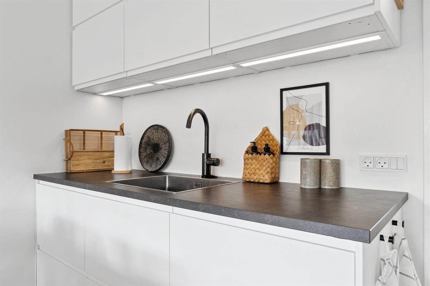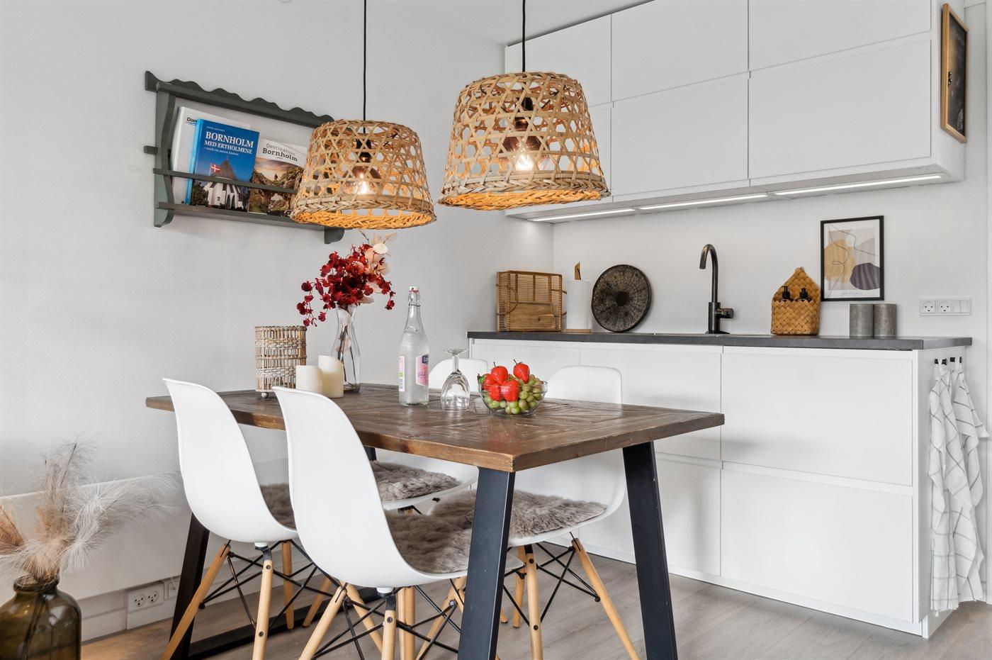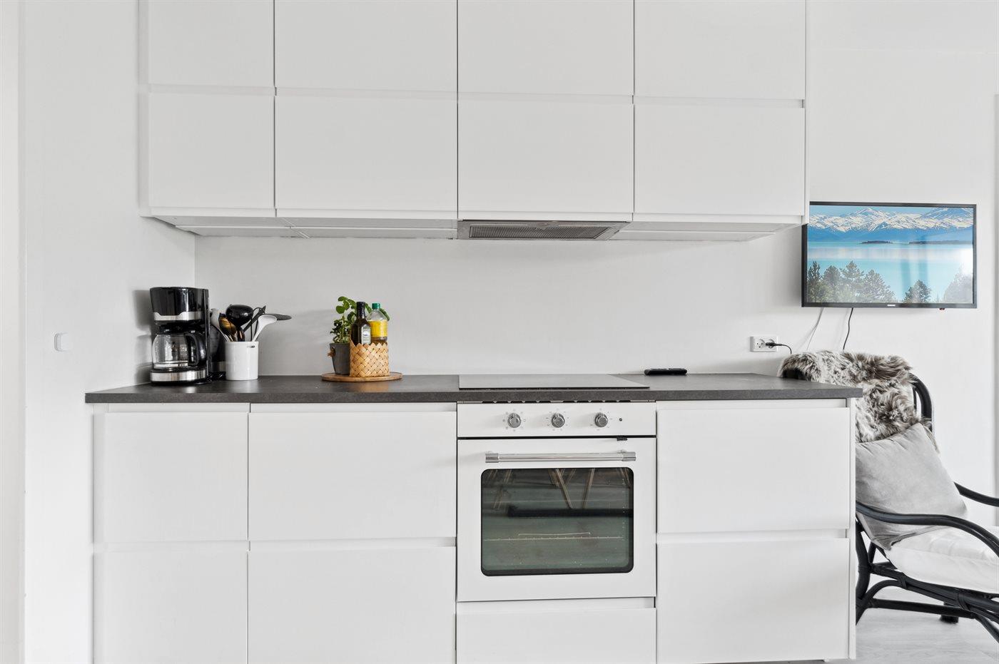 Køkkenet er udstyret med 1 køleskab. Der er 4 induktionskogeplader, varmluftovn, mikrobølgeovn samt opvaskemaskine.