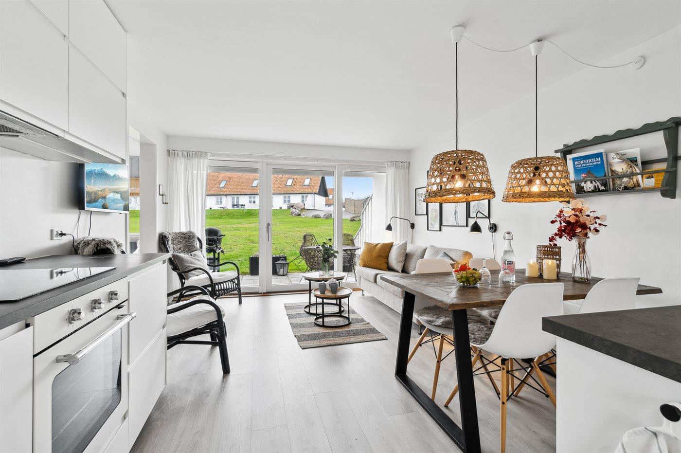 Smagfuldt renoveret ferielejlighed i Allinge med havudsigt, pool og fælles faciliteter tæt på vandet.