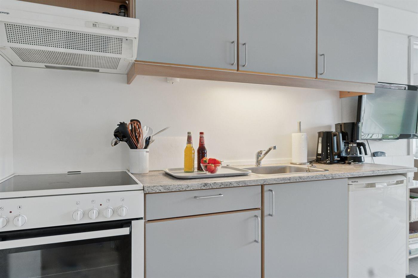 Køkkenet er udstyret med 1 køleskab. Der er 4 keramiske kogeplader, varmluftovn.