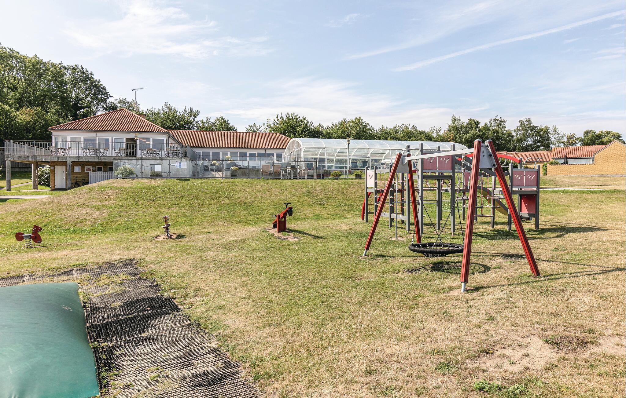Prikken over i'et er den fælles pool, der indbyder til friske dyp, alt imens børnene brænder energi af på legepladsen.