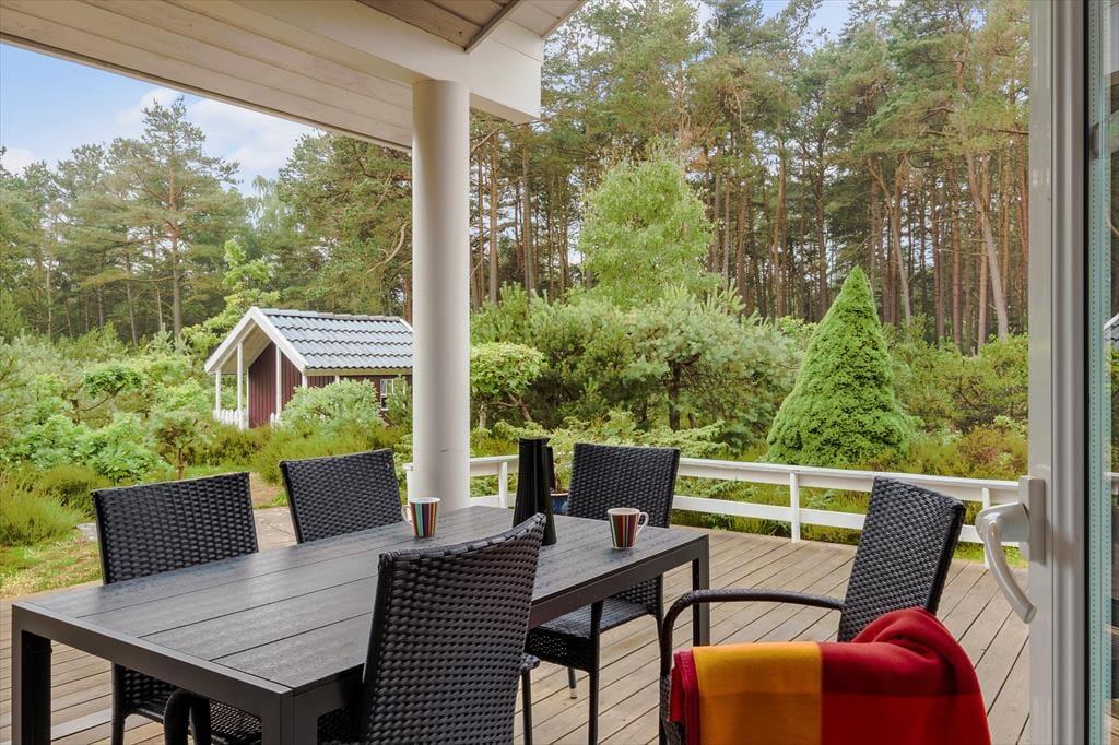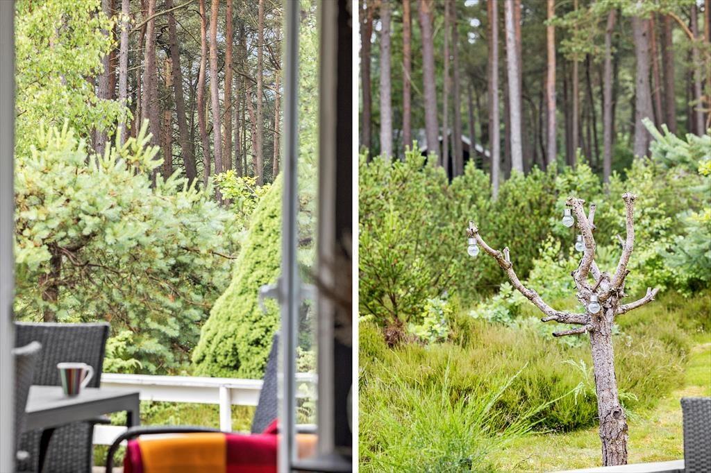 Huset er decideret smukt udenfor. Ud over husets æstetiske fremtoning, så ligger det på den smukkeste og dejligste natur-/skovgrund og man har således naturen lige uden for vinduet. På terrasserne rundt om huset kan aften- og morgensolen nydes og trods, at huset ligger midt i skoven, trænger solens stråler igennem det meste af dagen og ud på aftenen.