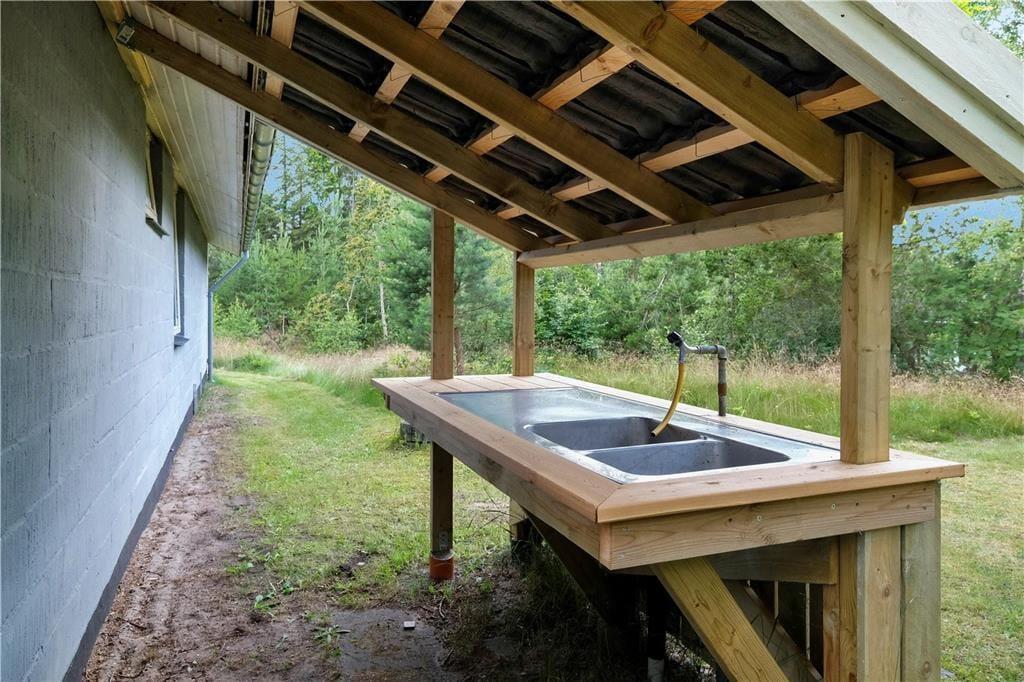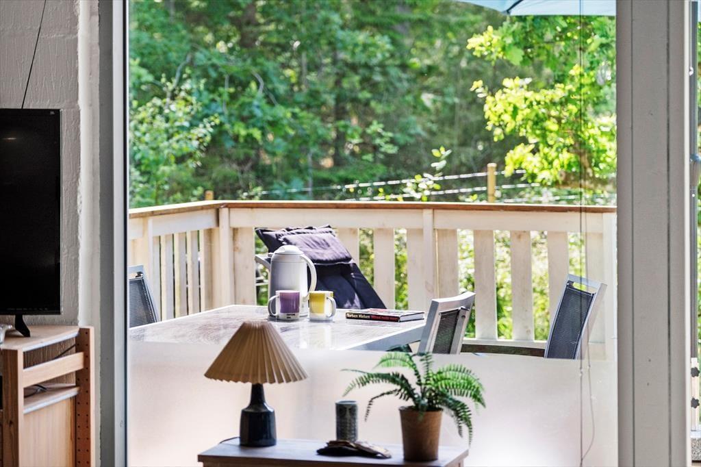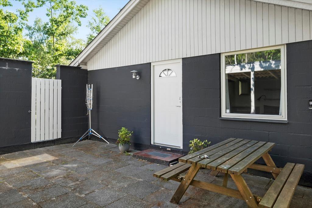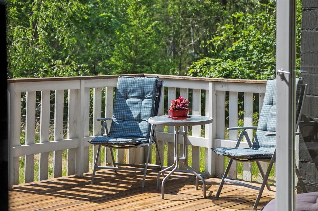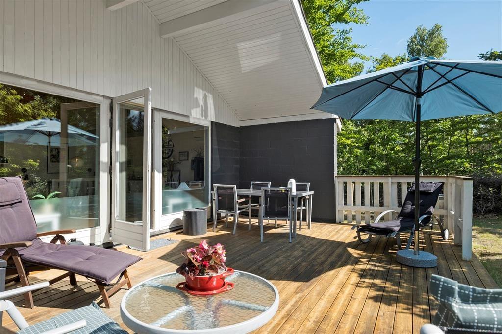 Huset ligger enormt natursmukt og fredeligt på en flot naturgrund. I forlængelse af husets stue, er der en overdækket terrasse, som vender mod sydvest, mens der på langsiden mod sydøst er morgenterrasse, der møder den tredje og sidste terrasse mod nordøst. Så alt i alt er der rigeligt med muligheder for at nyde solen og naturen udendørs mens kullene får den helt rigtige farve.