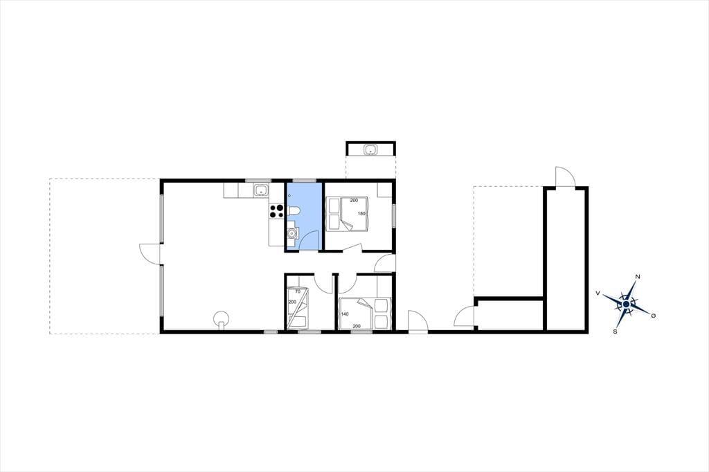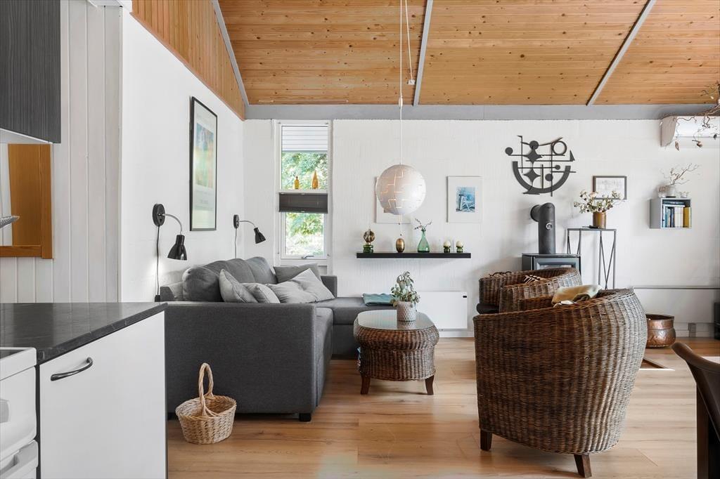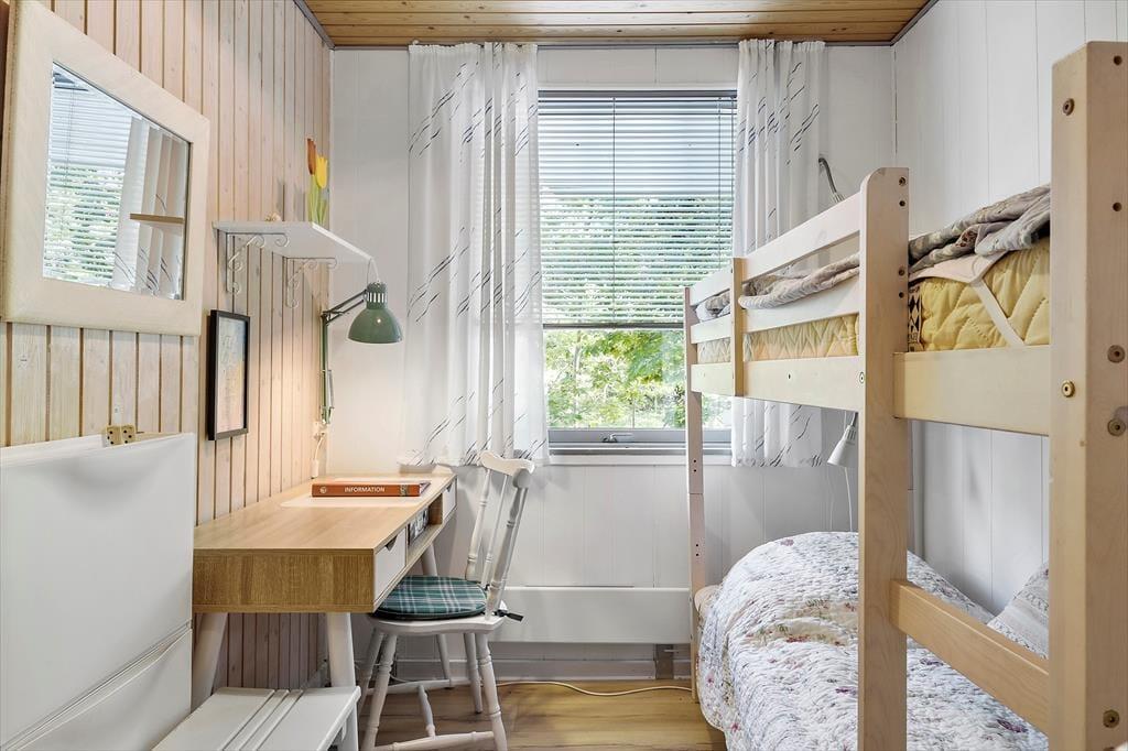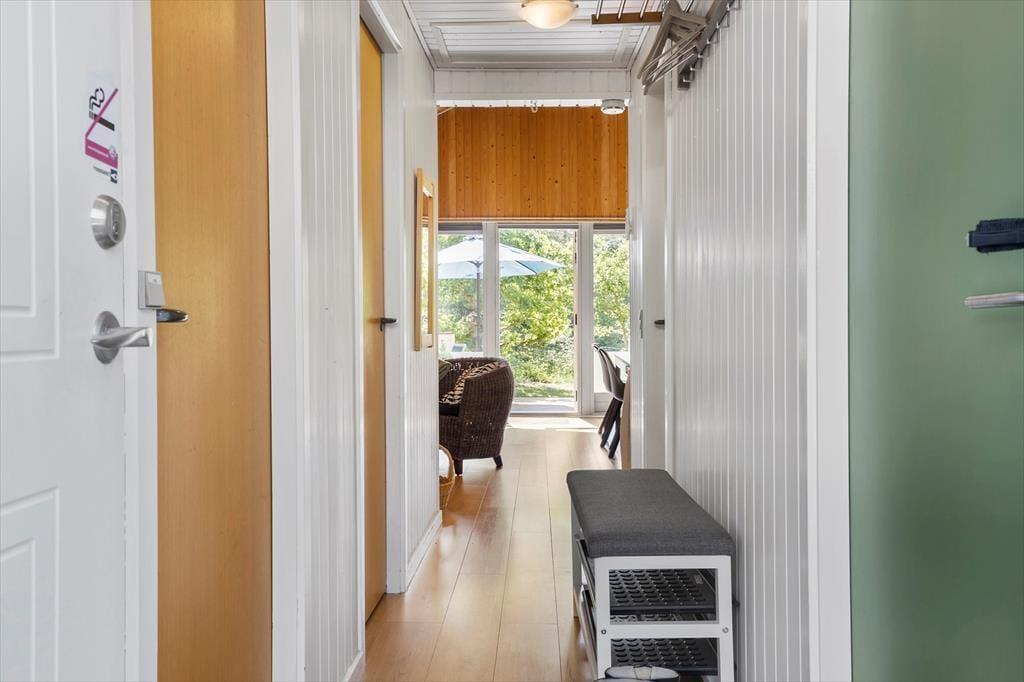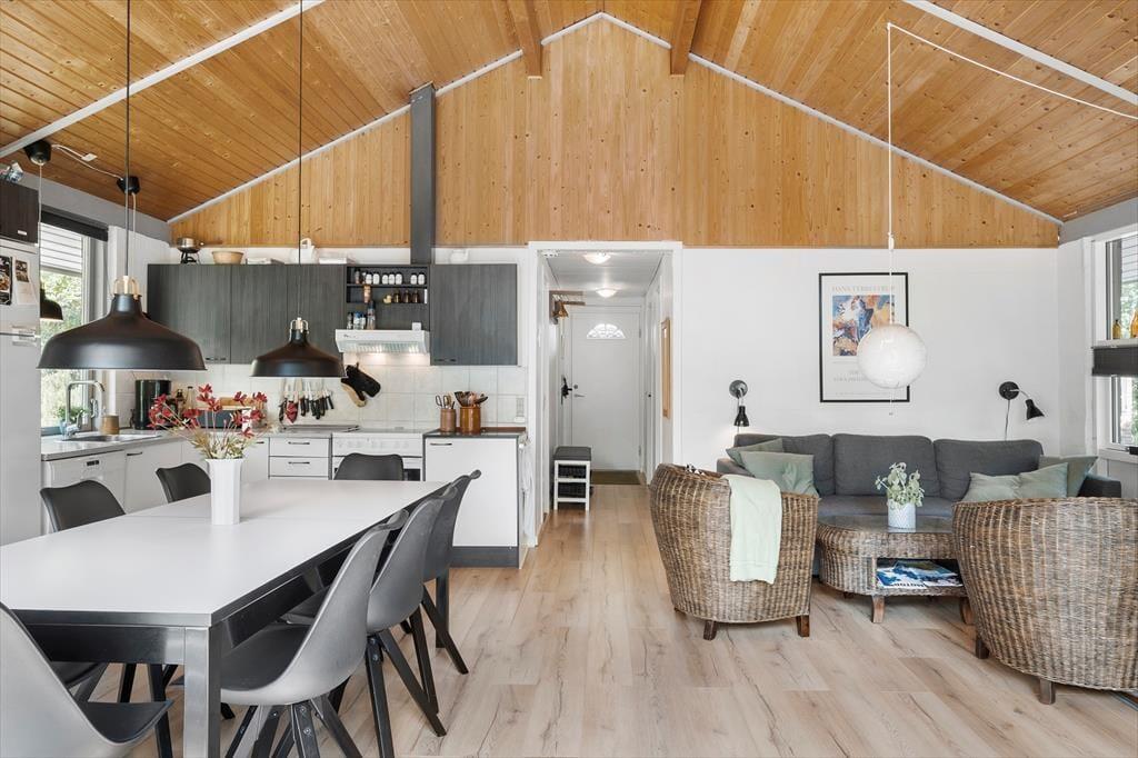 Sommerhuset består af et køkken-alrum-stue med god plads til hele familien. Stuen er lys og venlig takket være store vinduespartier og en lys og let indretning. Der er et helt nyt køkken fra 2018. Fra opholdsafdelingen er der via en lille gang adgang til husets gode badeværelse og de tre soveværelser med dobbeltseng i det store, 3/4 seng i det andet og køjeseng med lækre springmadrasser i det sidste værelse.