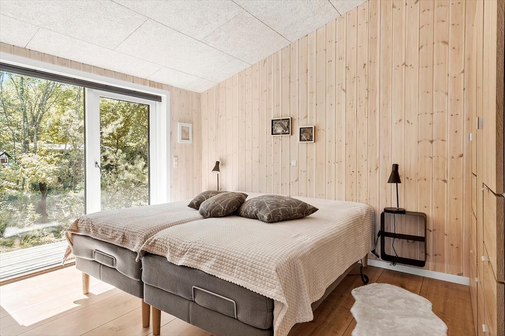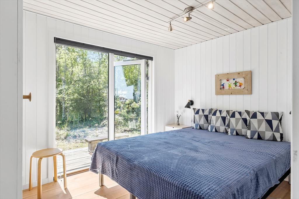 Udsigten til Kattegat er bare én af grundene til, at hyggestunderne i sommerhusets stue bliver ekstra gode. Efter en totalrenovering i 2023 fremstår opholdsrummet nemlig særligt skønt med flotte gulve, akustiklofter til kip og store vinduespartier, der ikke bare byder naturen, men også dagslyset velkommen indenfor. Det stilfulde møblement passer godt ind, og I får gode arbejdsforhold i det åbne køkken, mens brændeovnen og varmepumpen til sammen kan sørge for en behagelig temperatur selv på kølige dage. Også husets øvrige rum fremstår tjekkede, inklusiv brusebadeværelset såvel som de to soveværelser. Begge værelser har dobbeltseng hvoraf det ene er med elevation - desuden er værelserne udstyret med garderobeskab og udgang til terrassen.