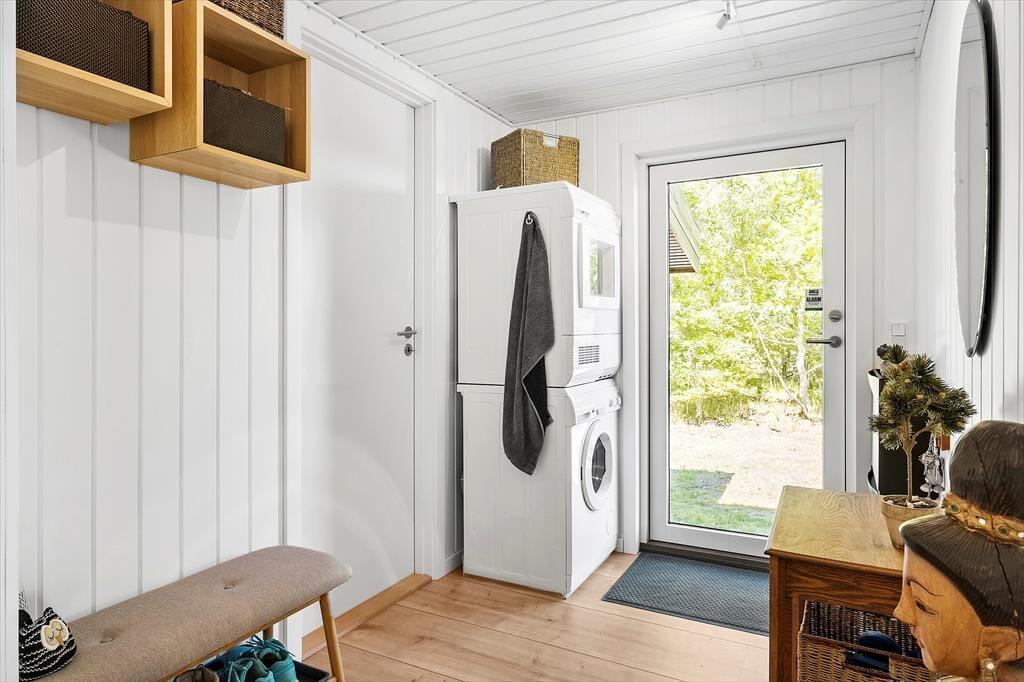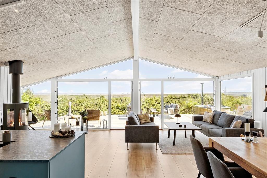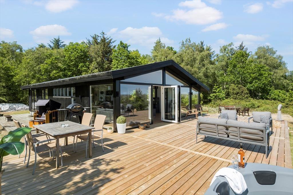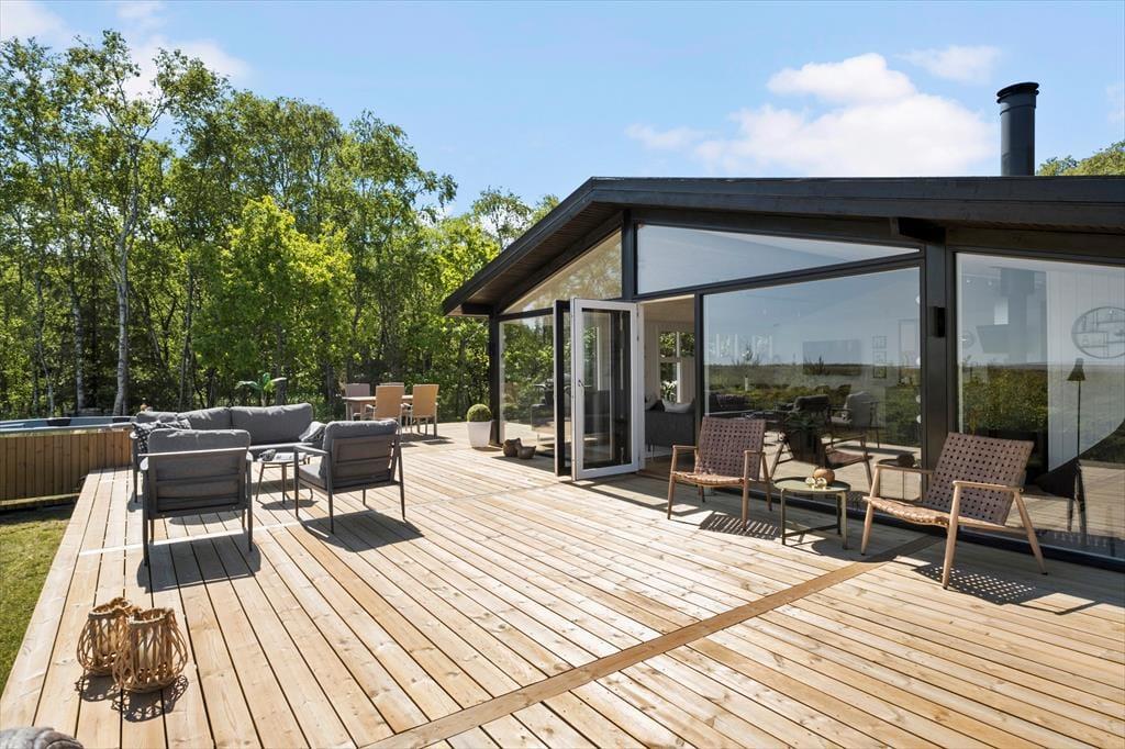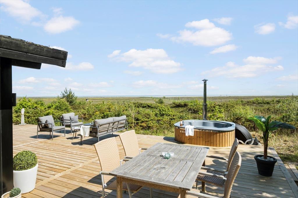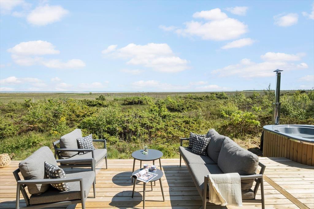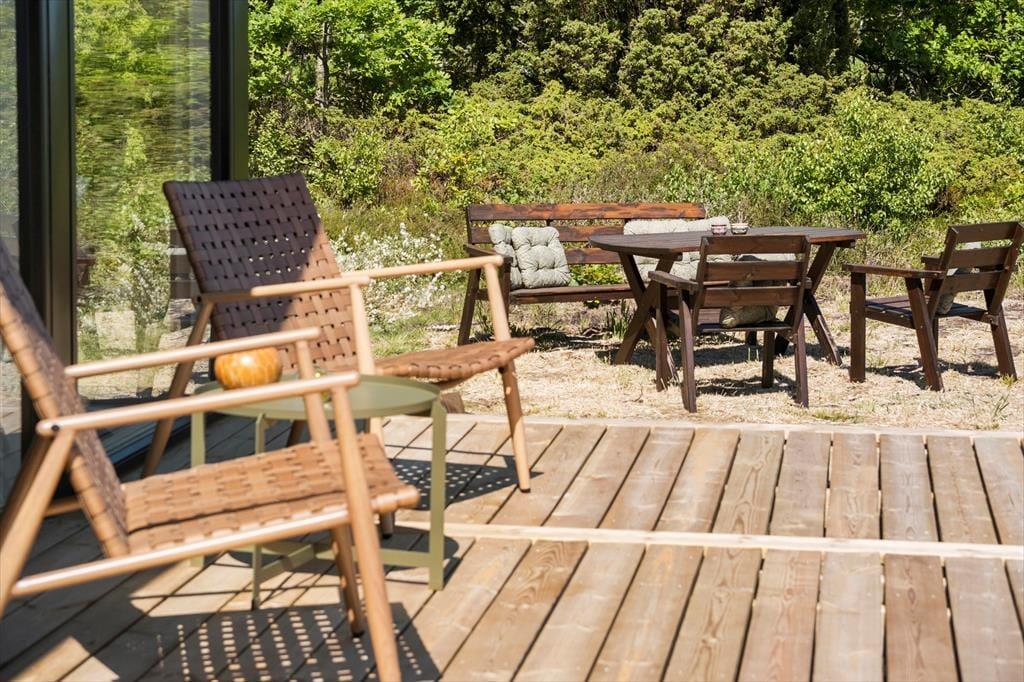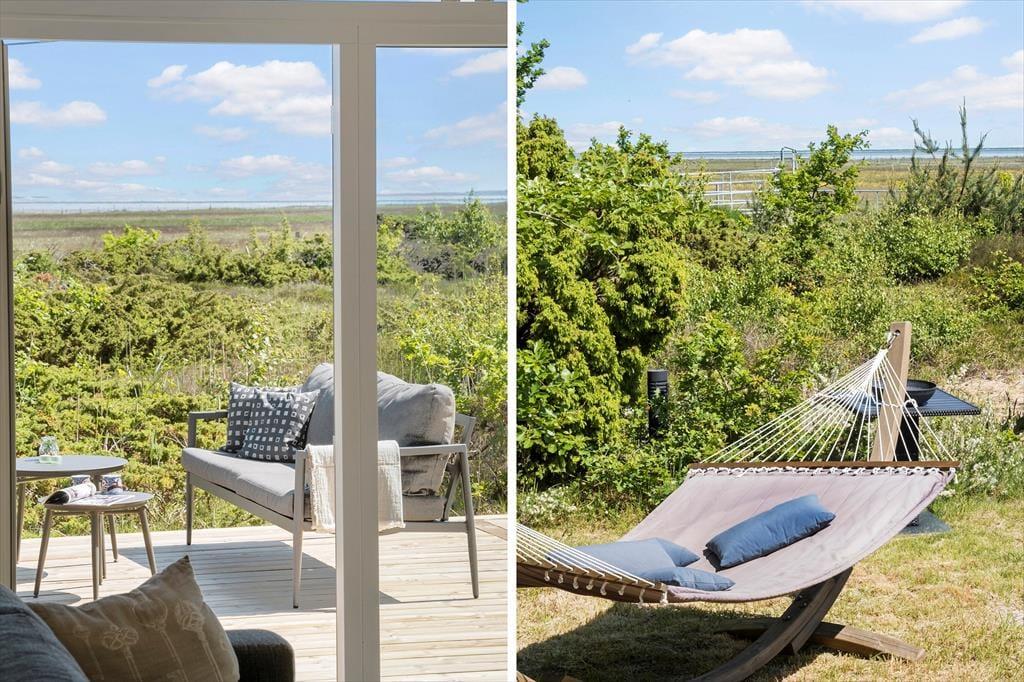 Ude i det fri får I en mindst lige så skøn og stemningsfuld ramme om ferielivet. Her er der nemlig masser af plads til at brede sig på den 70 kvm store træterrassen og på de grønne arealer, der rammes smukt ind af enebærbuske og træer. Mod Syd/øst holdes bevoksningen lav, så I kan skue ud over strandengen og Kattegat – ikke bare fra terrassen, men også fra husets lækre vildmarksbad. Badet er udstyre med massagefunktion der fuldender oplevelsen.