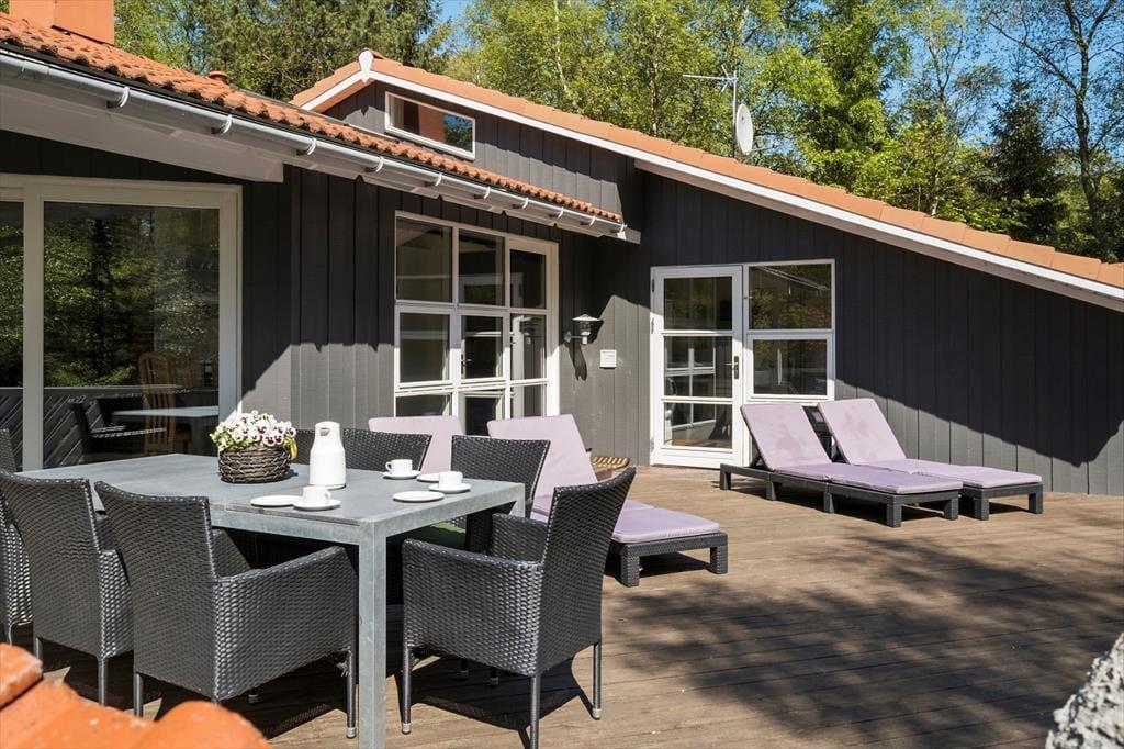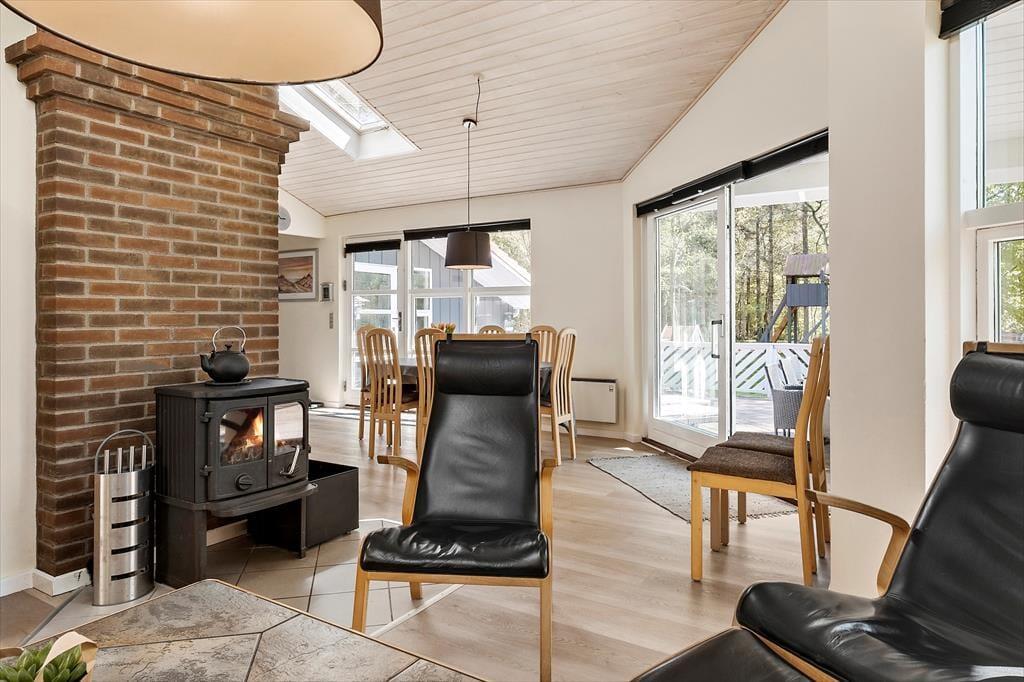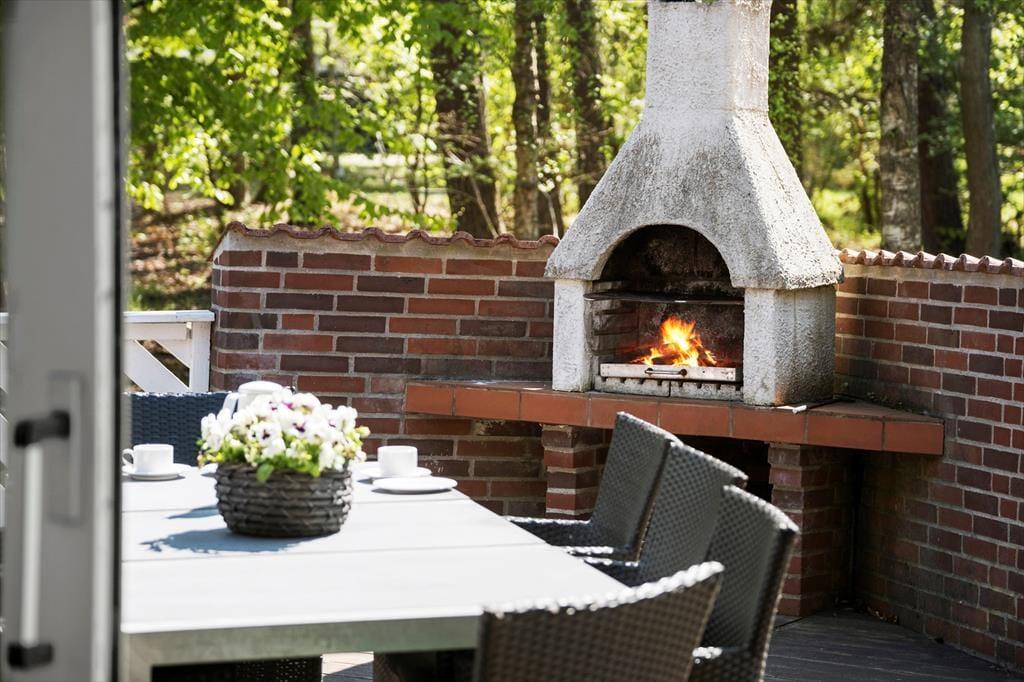 Den store naturgrund er en fredfyldt oase for både store og små feriegæster. Løv- og nåletræer rammer græsplænen ind på smukkeste vis, og hjørnet med legefaciliteter vil sikkert blive et hit for børnene, mens bilejere vil værdsætte carporten. Elsker I at slikke sol, er det herligt at kunne slå sig ned på den sydvendte terrasse – og hvis I bliver hængende helt indtil aftentid, kan I tænde op i stenovnen og nyde synet af flammerne, mens mørket falder på.