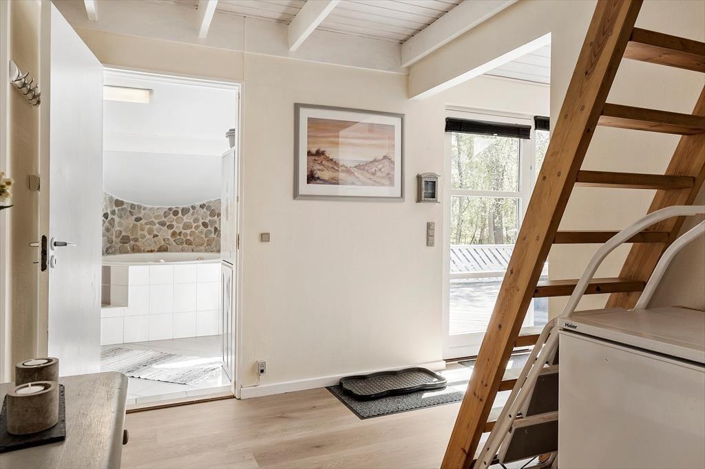 De naturskønne omgivelser bliver inviteret indenfor i det 105 m2 store sommerhus, så I kan se lige ud på grundens flotte træer. Måske vil I endda se vilde dyr og fugle komme forbi, mens I hygger jer nær stuens brændeovn eller sidder samlet omkring spisebordet. I det åbne køkken har I gode arbejdsforhold, når der skal laves mad, og hvis det er ved at være sengetid, kan I fordele jer på de tre gode soveværelser. Hemsen kan også tages i brug, hvis børnene synes, at det er hyggeligt at have deres egen ”hule” deroppe. Et badeværelse med bruser og et gæstetoilet hører med til planløsningen, og endelig er der wellnessrummet, der byder på en dampbruser, en sauna og et lækkert standvandsspabad.