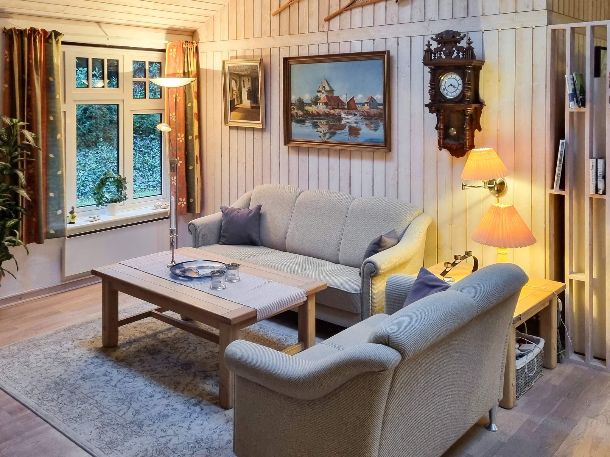 1 Opholdsstue: Brændeovn, radio, stereoanlæg med cd, dvd-afspiller, tv, parabol, høj stol