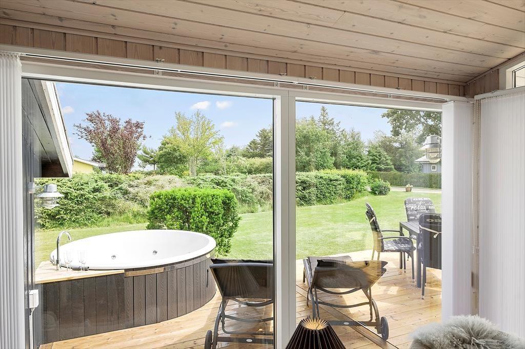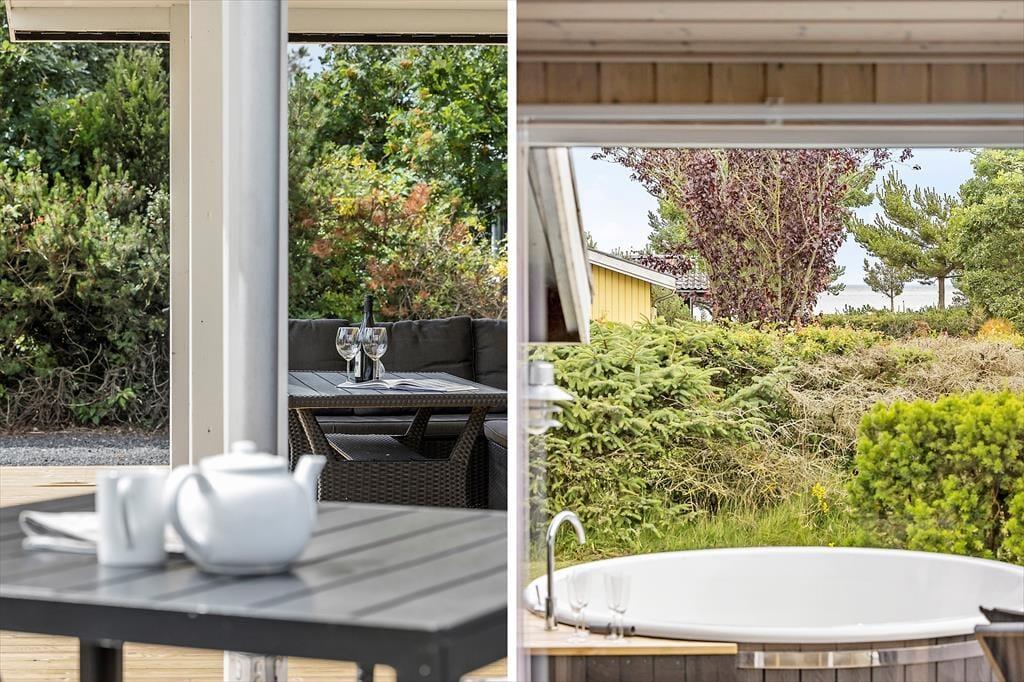 Sommerhuset ligger midt i en dejlig have, som omkranses af grøn beplantning. På den store græsplæne kan børnene boltre sig imens de voksne feriegæster læne sig tilbage i havemøblerne op den store, delvist overdækkede terrasse.