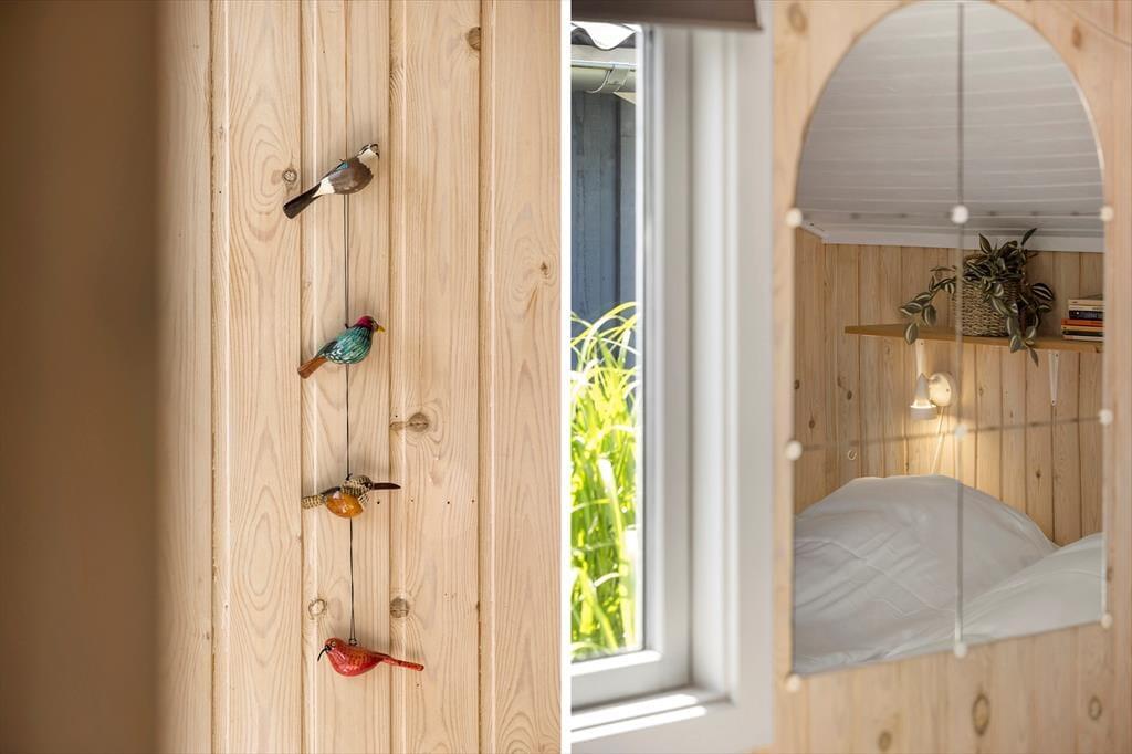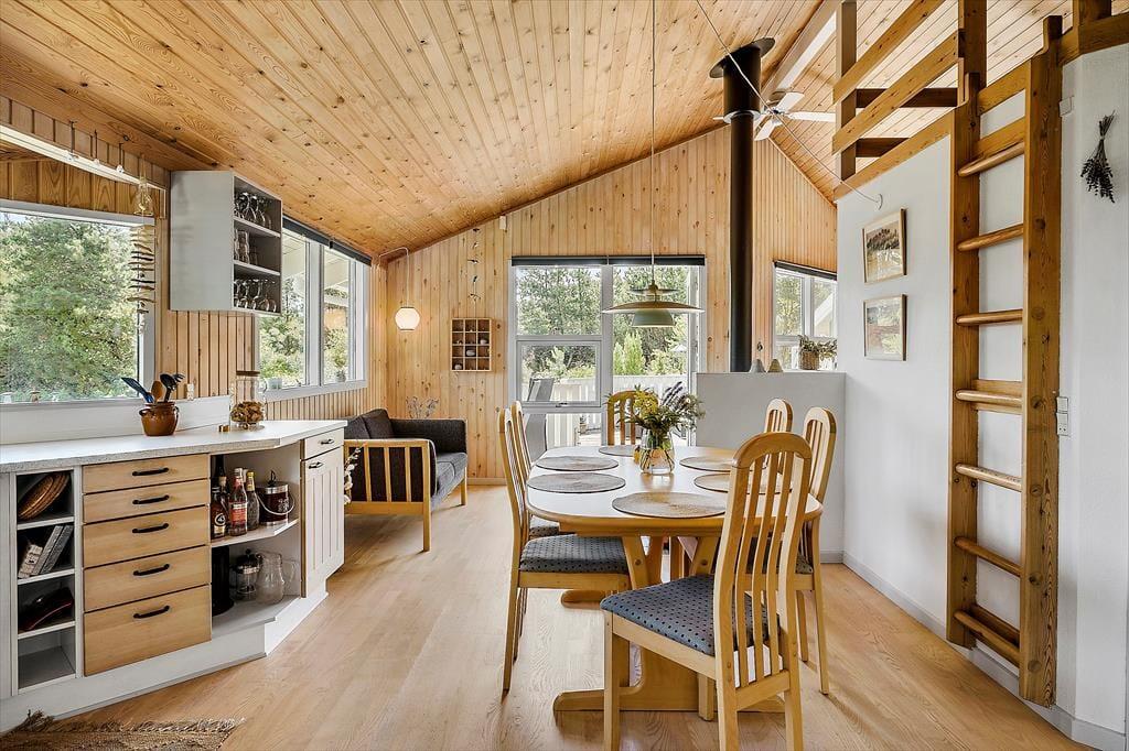 Træd ind i dette dejlige sommerhus og oplev en skøn atmosfære præget af naturlig charme og hygge. Indretningen er lys og indbydende, og huset byder på flere hyggelige kroge, hvor du kan slappe af med en god bog eller en kop kaffe. Den åbne planløsning forbinder køkkenet og stuen, hvilket skaber en rummelig og social ramme for madlavning og hyggelige stunder med familien. Brændeovnen i stuen giver en ekstra varme og atmosfære på kølige aftener, mens store vinduer lukker masser af lys ind og giver en smuk udsigt til den omkringliggende natur. Sommerhuset har tre dejlige soveværelser, som alle indbyder til en god nats søvn efter en dag fyldt med oplevelser.