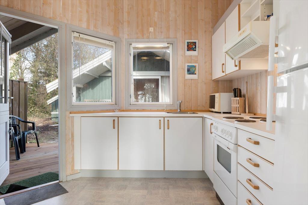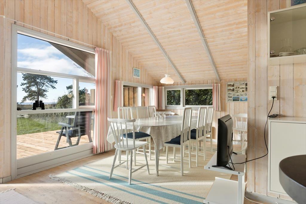 Når du træder indenfor i sommerhuset, mødes du straks af en varm og hyggelig stemning. De lyse rum, de komfortable møbler og den åbne planløsning inviterer til afslapning og samvær. Her er masser af plads til at nyde ferien i ro og mag. Den store stue er perfekt til hyggelige aftener med brætspil, film eller en god samtale, mens du nyder varmen fra brændeovnen på de køligere dage. Det åbne køkken og spisepladsen giver mulighed for at lave lækre måltider sammen, mens du kigger ud på den fantastiske udsigt over vandet.