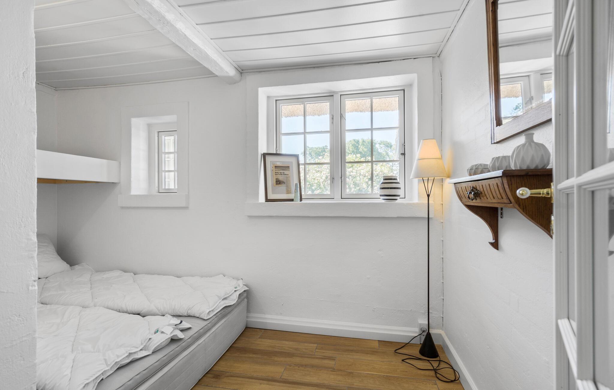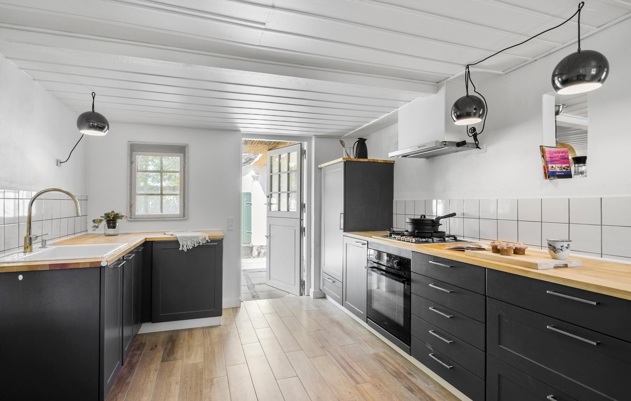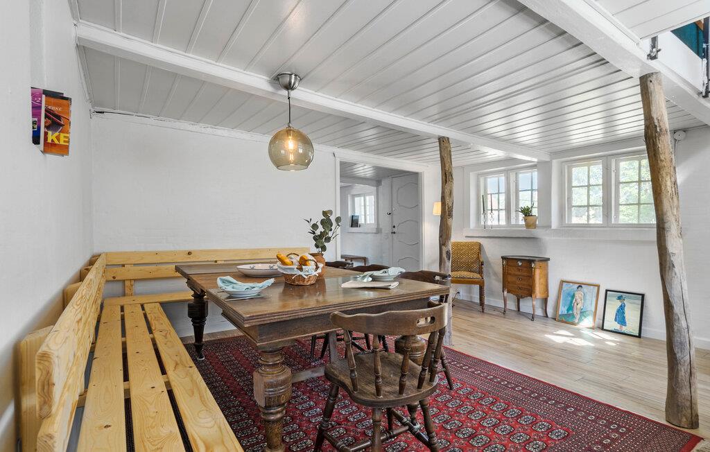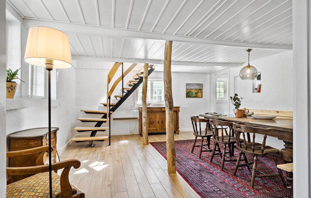 Hvis I er på udkig efter en særdeles charmerende bolig til årets familieferie, er dette dejlige stråtagshus i Alslev det helt rette valg for jer. Huset ligger på en stor, grøn grund tæt ved den lille landsbys kirke, og indvendigt emmer det af hygge og komfort over flere etager. De rustikke indretningsdetaljer suppleres ganske fremragende af de moderne faciliteter, som tilsammen skaber en boligoplevelse, der er både afslappende og behagelig. Køkkenet er særdeles veludstyret, så lad endelig familiens kokke kræse om livretterne, mens andre dækker op til en hyggelig middag ved det flotte spisebord af træ. Skulle vejret vise lidt tænder, er bare at fyre op i brændeovnen, der giver det helt rigtige lydtapet til aftenhyggen i den dejlige stue under skråvæggene.