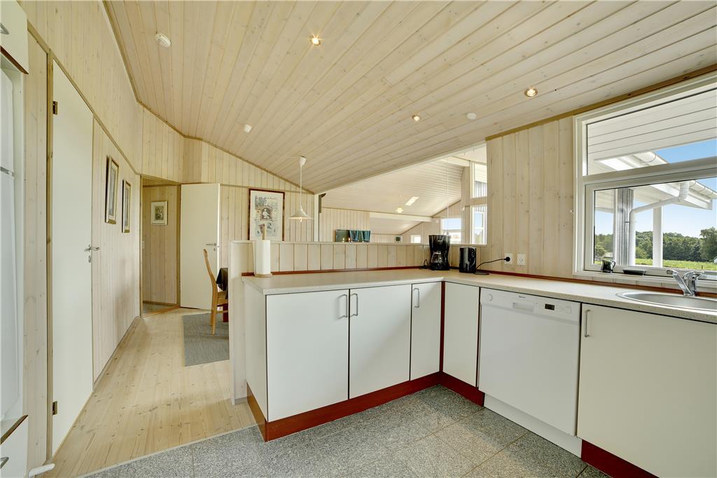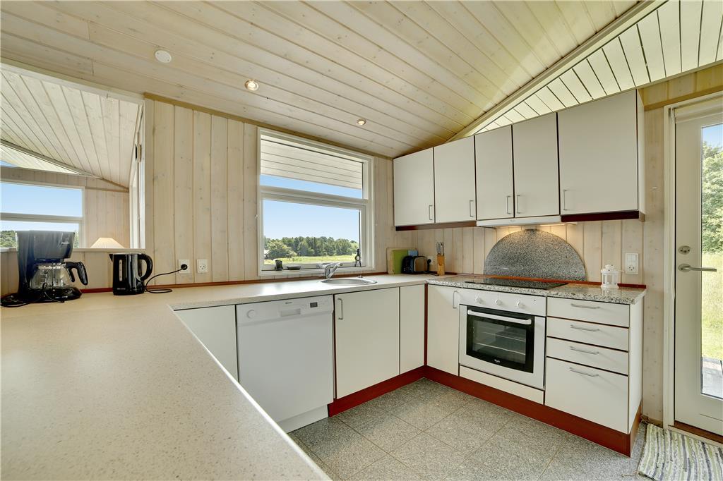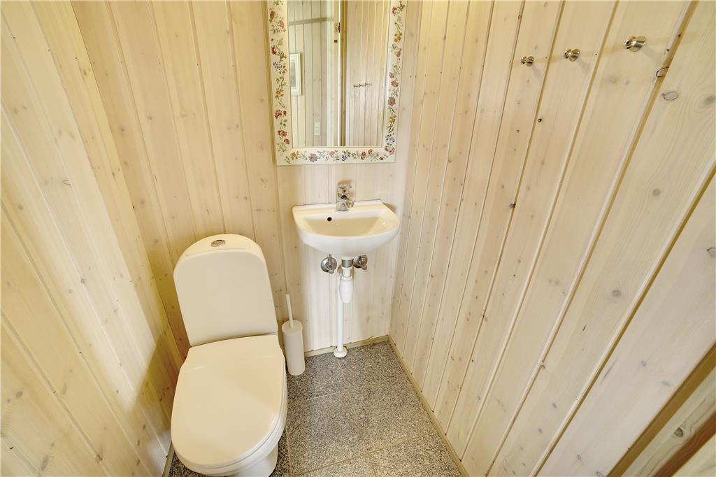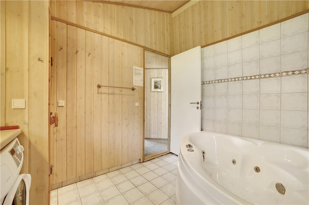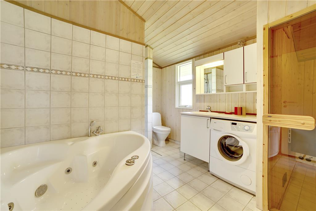 Køkkenet er stort og funktionelt med god bordplads. Her er også opvaskemaskine. Der et stort badeværelse med både sauna og spabad. Desuden er der vaskemaskine og tørretumbler i huset, samt et ekstra, mindre toilet.