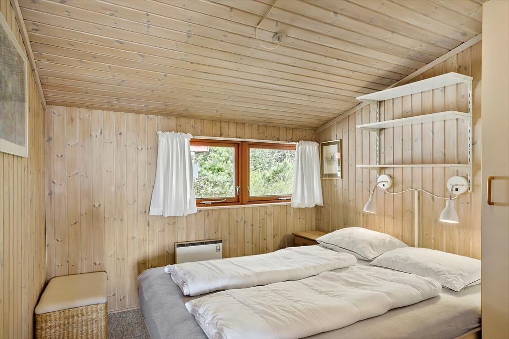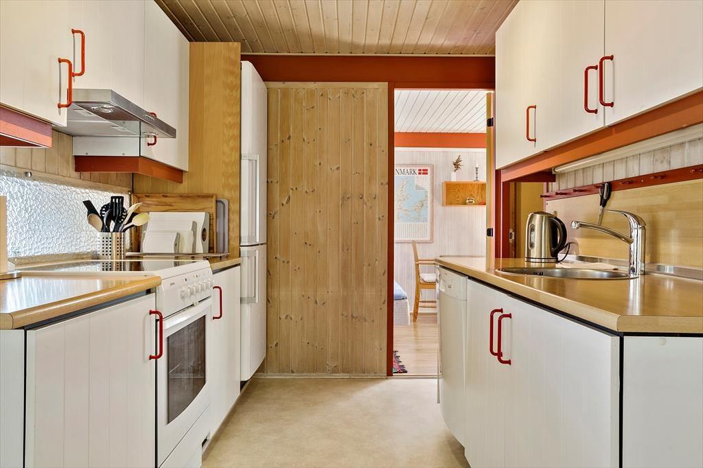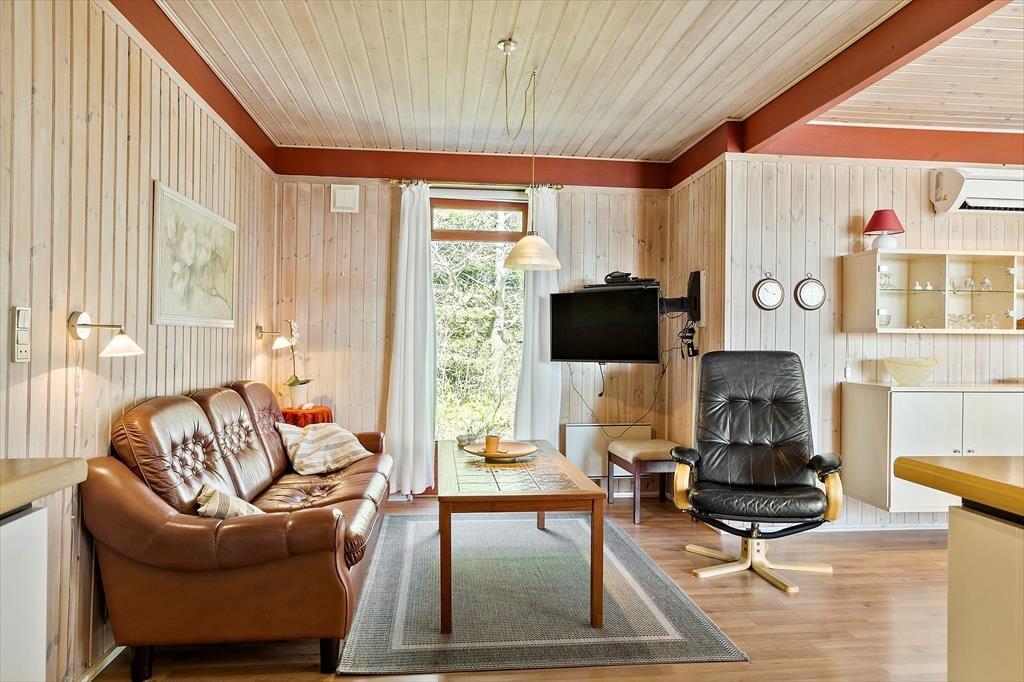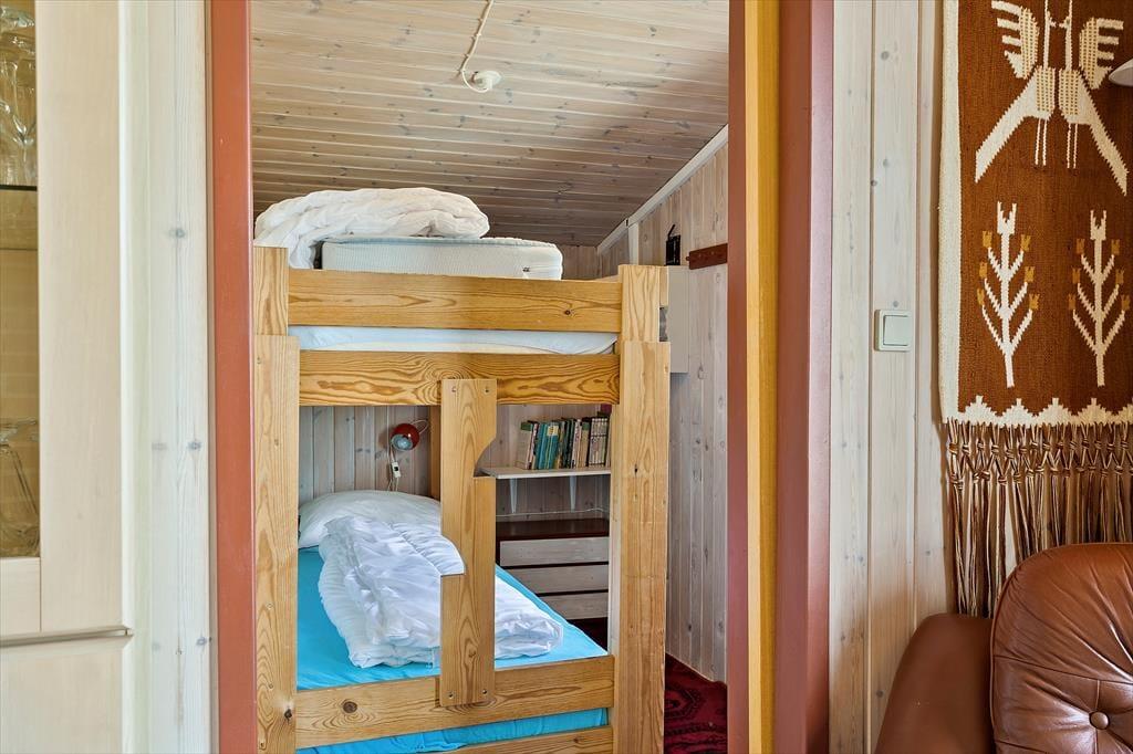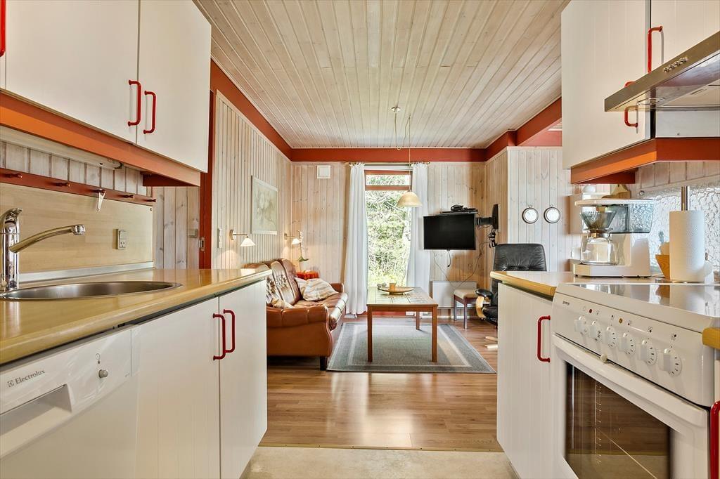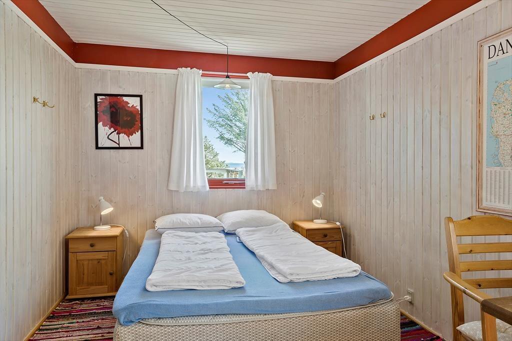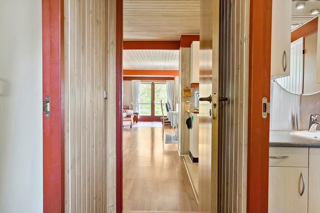 Inden døre er sommerhuset indrettet med fokus på hygge og komfort. Et tosidet køkken ligger i åben forbindelse med stuen, som er et stort og skønt opholdsrum med flere indbydende opholdspladser og en vidunderlig udsigt over vandet. Spisebordet er et dejligt sted at slå sig ned, hvis ikke du hellere vil slænge dig i et af sofahjørnerne – og hvis du tænder op i brændeovnen og finder brætspil eller gode bøger frem, er det fristende at blive hængende i timevis. Et badeværelse med bruser ligger lige ved entréen, og når det er sengetid, har du og din familie fire gode soveværelser at fordele jer på.