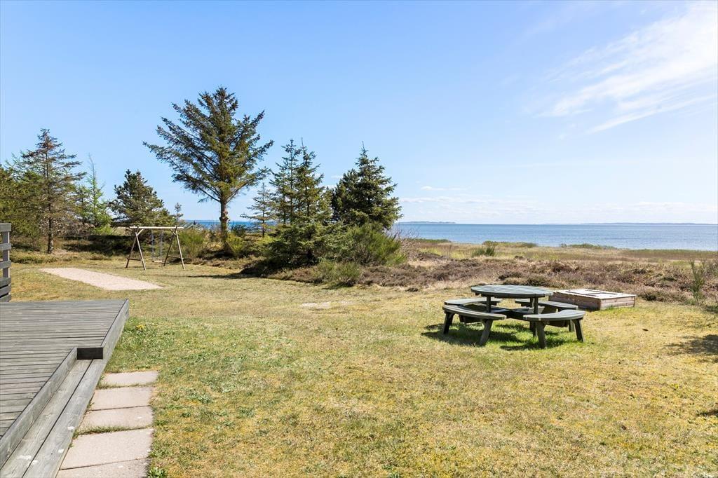 Træterrassen, der breder sig mod syd og øst, er noget helt særligt, for den er ikke bare stor, men byder også på den skønneste udsigt over vandet. Der venter også andre terrasser og uforstyrrede lækroge rundt om huset, og hvis de yngste feriegæster trænger til lidt underholdning, er der både gynge og sandkasse at hygge sig med. Hele familien kan udfordre hinanden på petanquebanen, og hvis en af jer har været ude med fiskestangen og har fået bid, er det rart, at der står et praktisk fiskerensebord med vand og håndvask i forlængelse af den overdækkede terrasse.