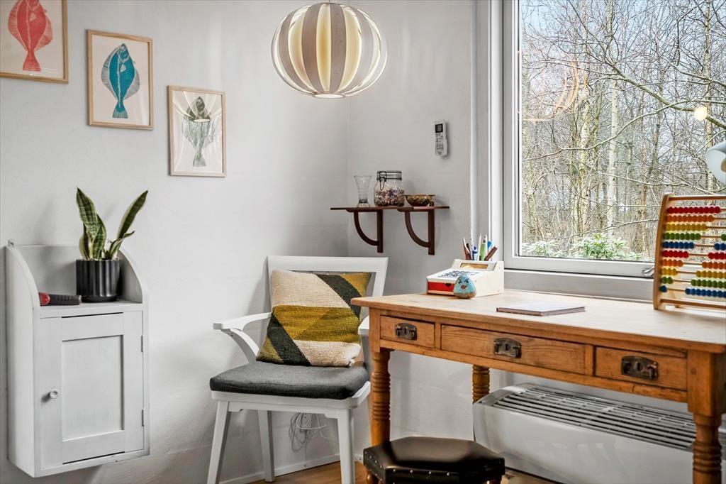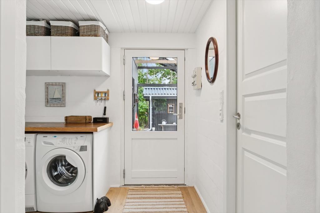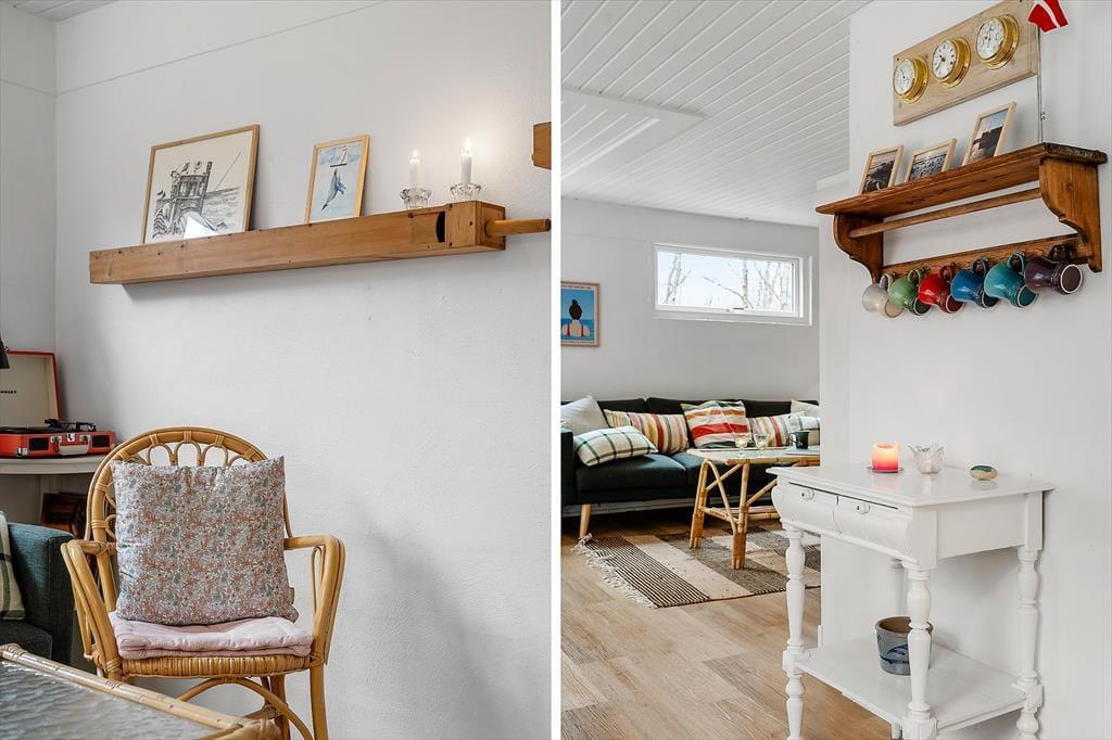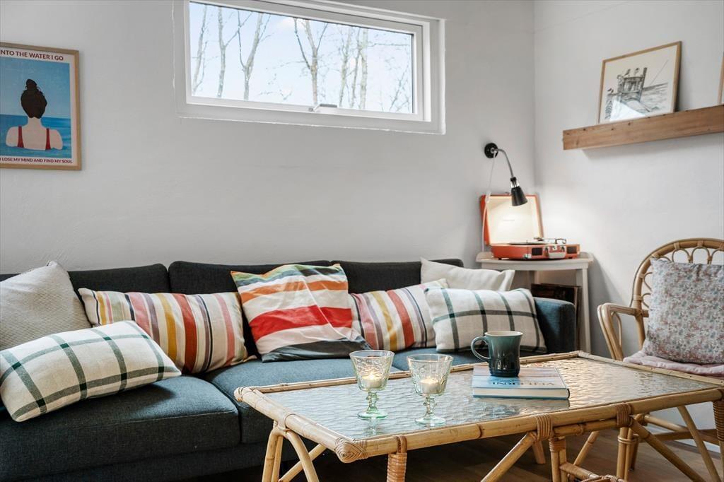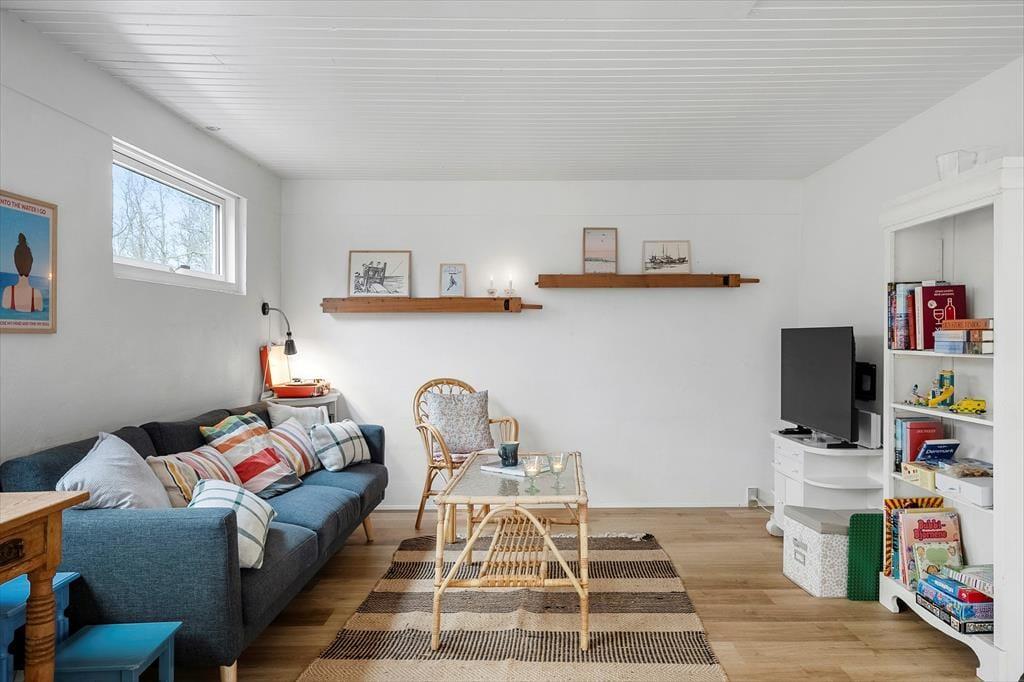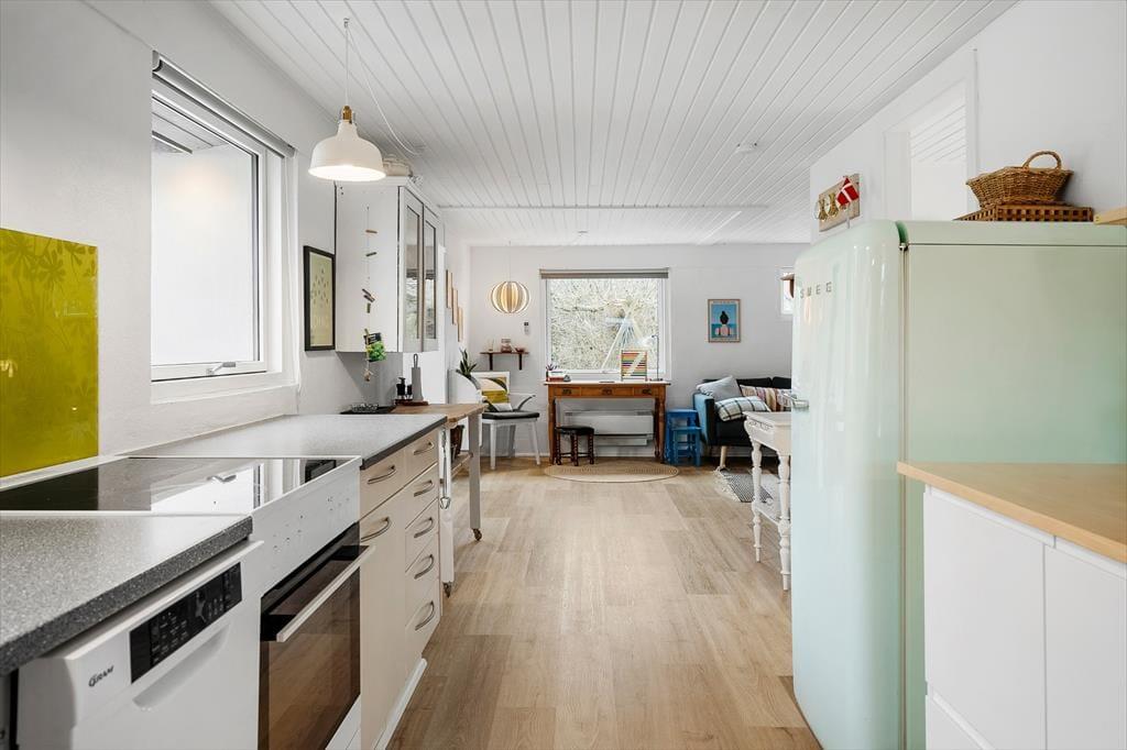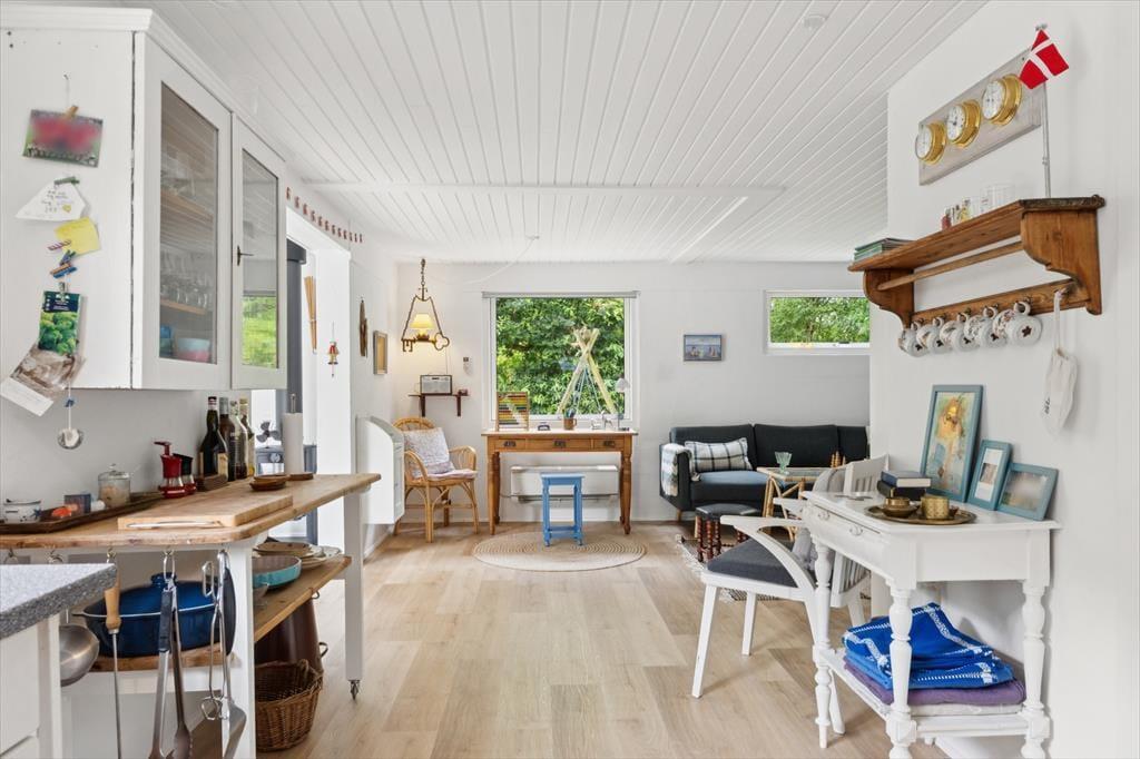 Når du træder ind i sommerhuset, er det første du mærker den lyse og hyggelige atmosfære, der breder sig i hele opholdsrummet. Her kan du slå dig ned i sofaen, mens flammerne danser i brændeovnen og spreder en behagelig varme. Forestil dig duften af friskbrygget kaffe, en god bog i hånden og fjordvinden, der lige netop kan høres gennem de åbne døre mod terrassen. Køkken og stue ligger i åben forbindelse, så feriemåltiderne bliver en naturlig del af samværet – også når nogen lægger sidste hånd på aftensmaden, mens andre spiller brætspil eller slapper af i sofaen. Overalt er indretningen enkel, lys og komfortabel og skaber rammen om en ferie, hvor I kan lande i roen og bare være sammen.