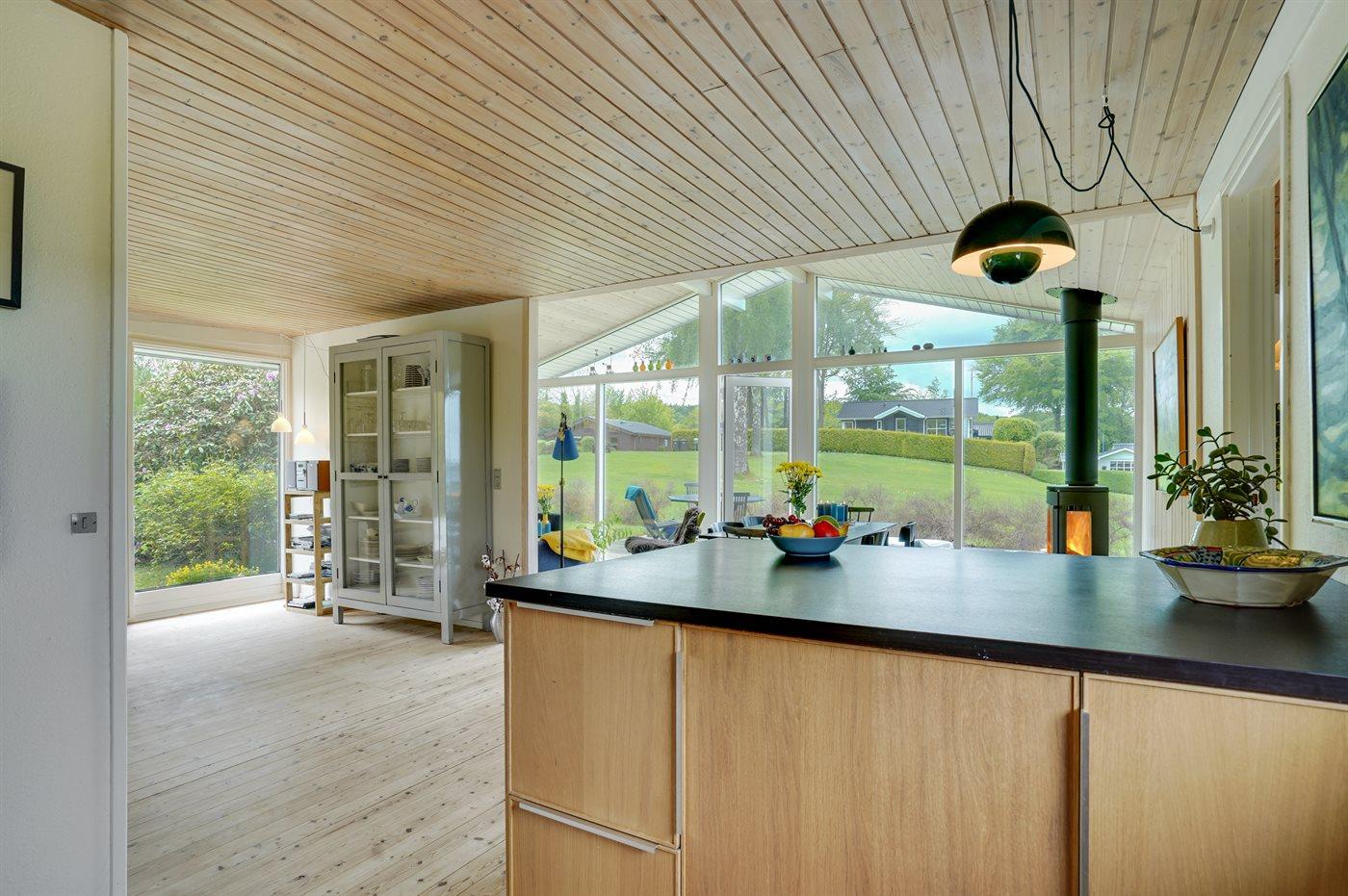 Et virkelig skønt sommerhus med en hyggelig indretning beliggende i et roligt og naturskønt omåde lige ved vandet med udsigt til fjorden fra såvel hus som grund. Huset ligger for enden af blind vej, ud til grønt fællesareal, på en dejlig og delvis lukket grund med skønne terrasser rundt om huset.