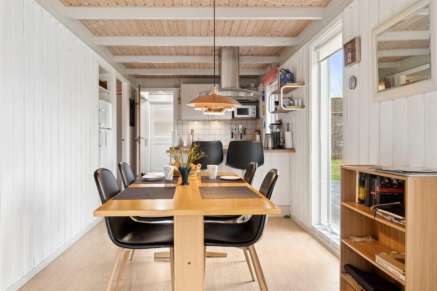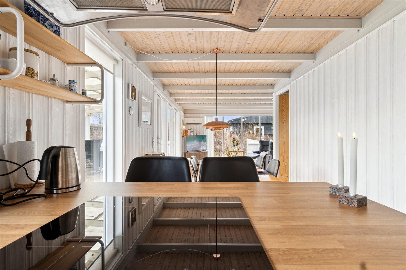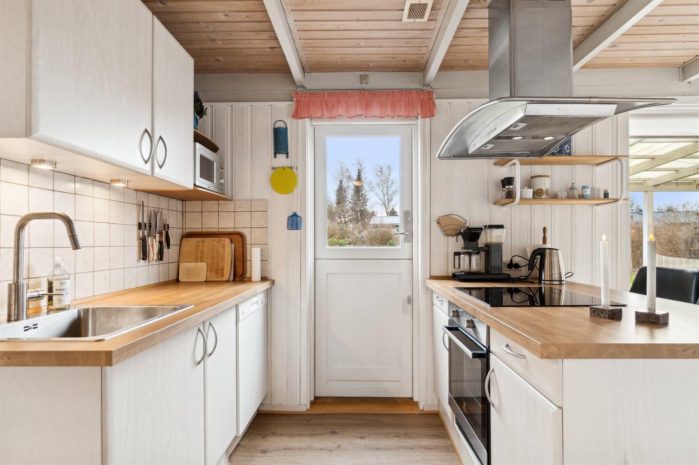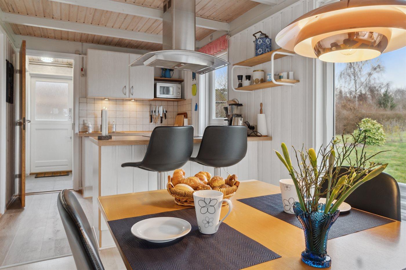 Køkkenet er udstyret med 1 køleskab. Der er 4 induktionskogeplader, varmluftovn, mikrobølgeovn samt opvaskemaskine.