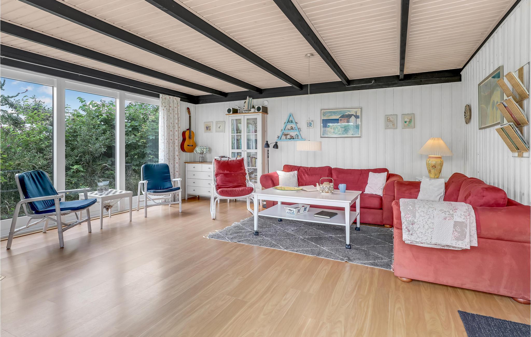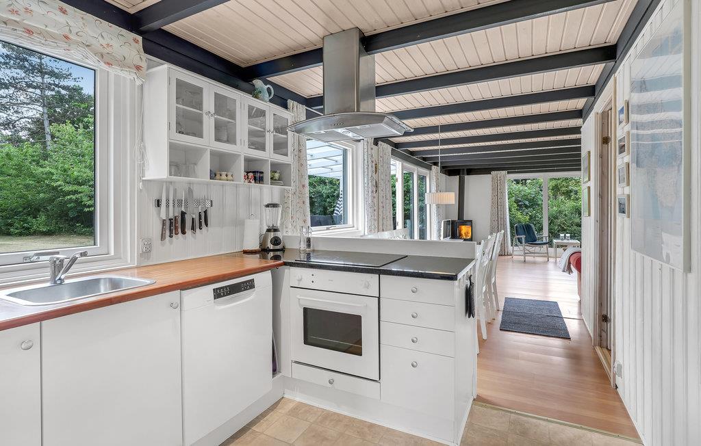 Huset fremtræder pænt og indbydende indendøre med et godt køkken/alrum/opholdsstue med brændeovn til de lidt køligere dage. Stuen er stor, og her kan I sætte jer godt til rette og spille nogle af de mange brætspil i kommoden og i skuret.