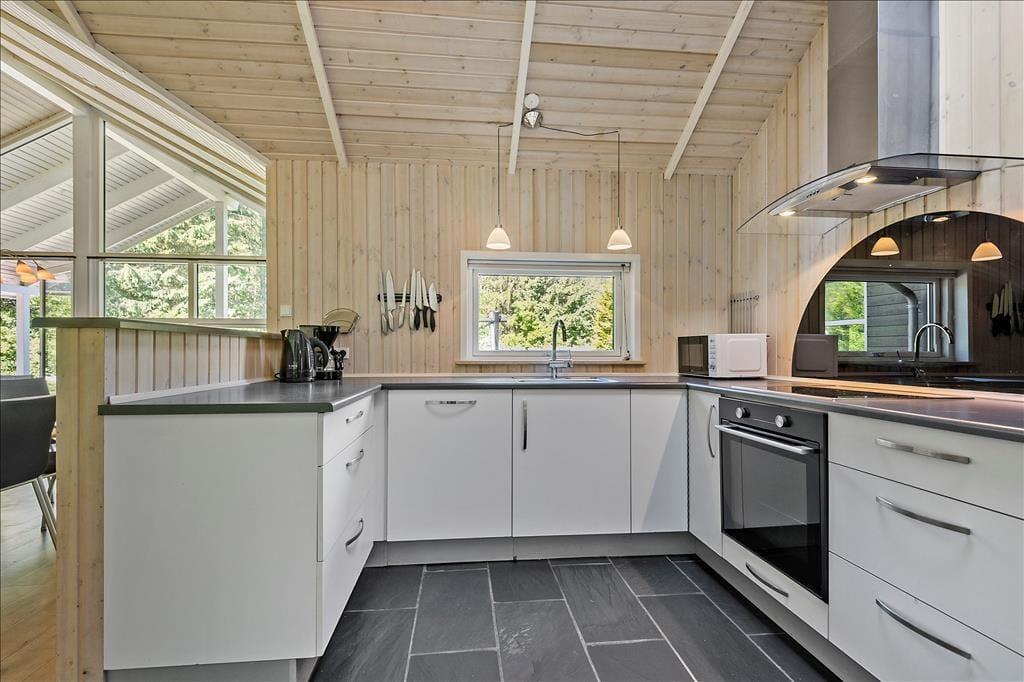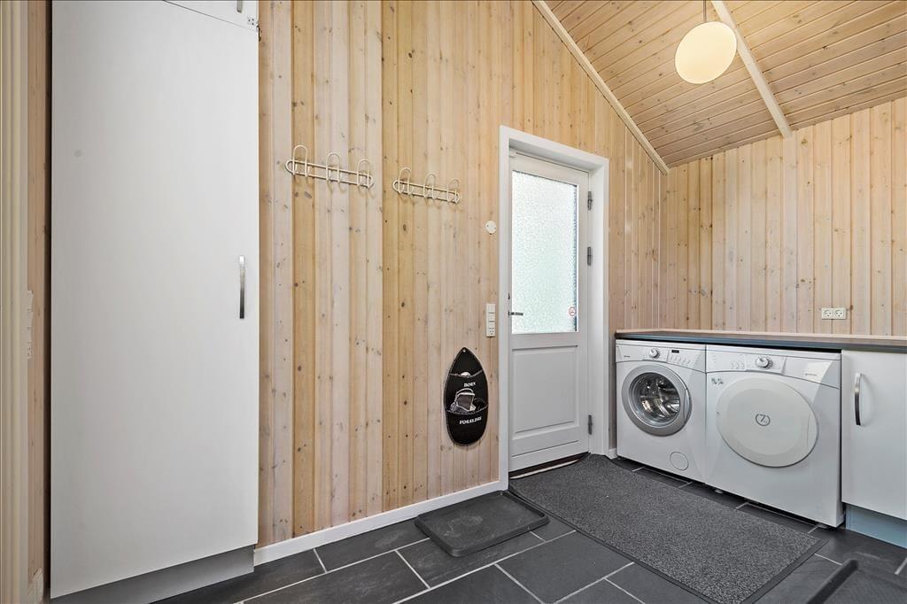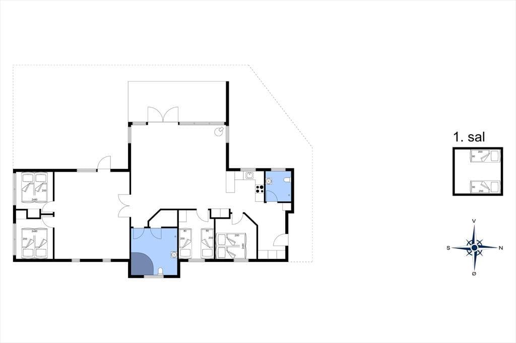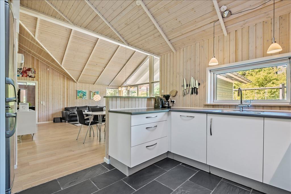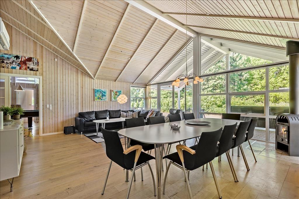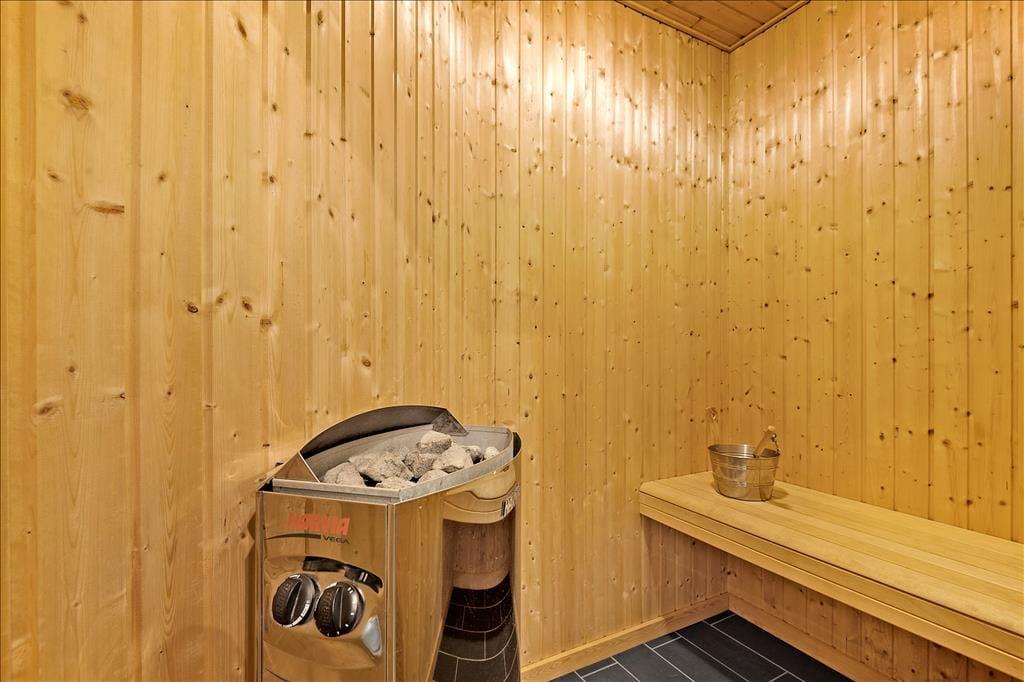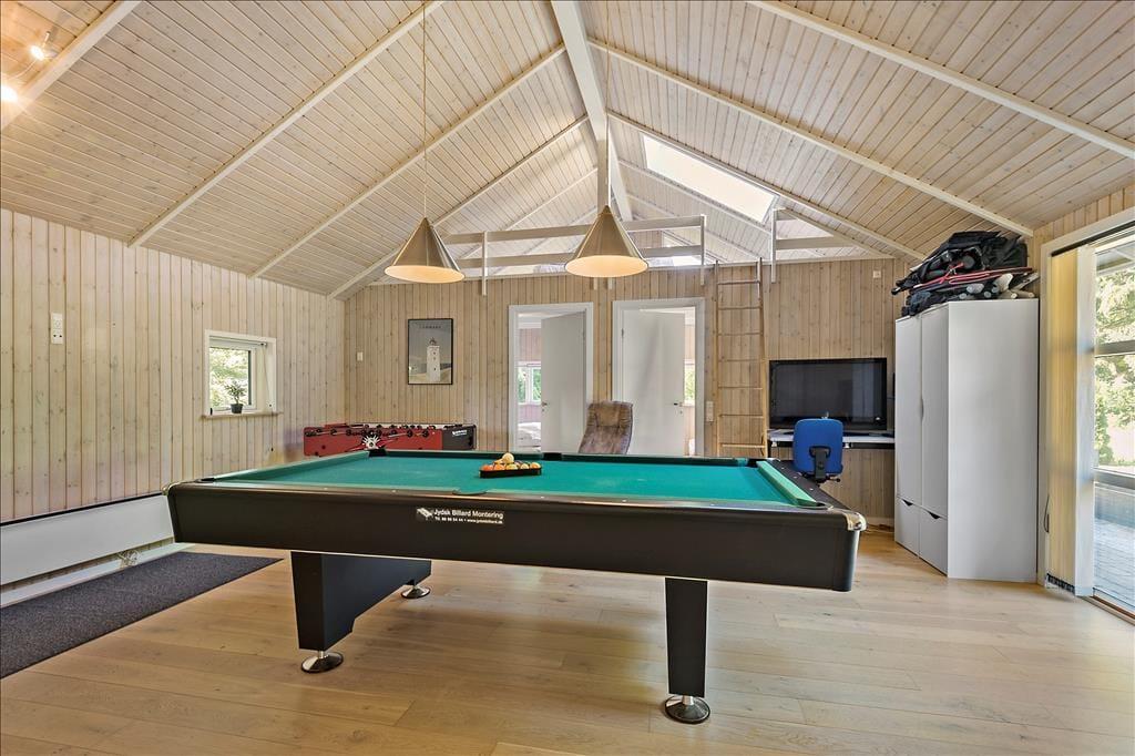 Alle rum i det 139 m² store sommerhus fremstår lyse og indbydende – ikke mindst den højloftede stue, hvor store vinduespartier, en brændeovn og pænt møblement bidrager til den gode atmosfære. Fra stuen er der åben forbindelse til et veludstyret køkken, og herfra kan I fortsætte videre til en rummelig entré, som byder på både vaskemaskine og tørretumbler. Med til planløsningen hører også to badeværelser, hvoraf det største er med både spabad og sauna, og med fire gode soveværelser og en hems er der sengepladser nok til ti personer inden døre. Skal hele ferien ikke bruges på søvn og afslapning, er det skønt, at sommerhuset også byder på et stort aktivitetsrum, hvor I kan spille bordtennis, bordfodbold, pool og dart.
