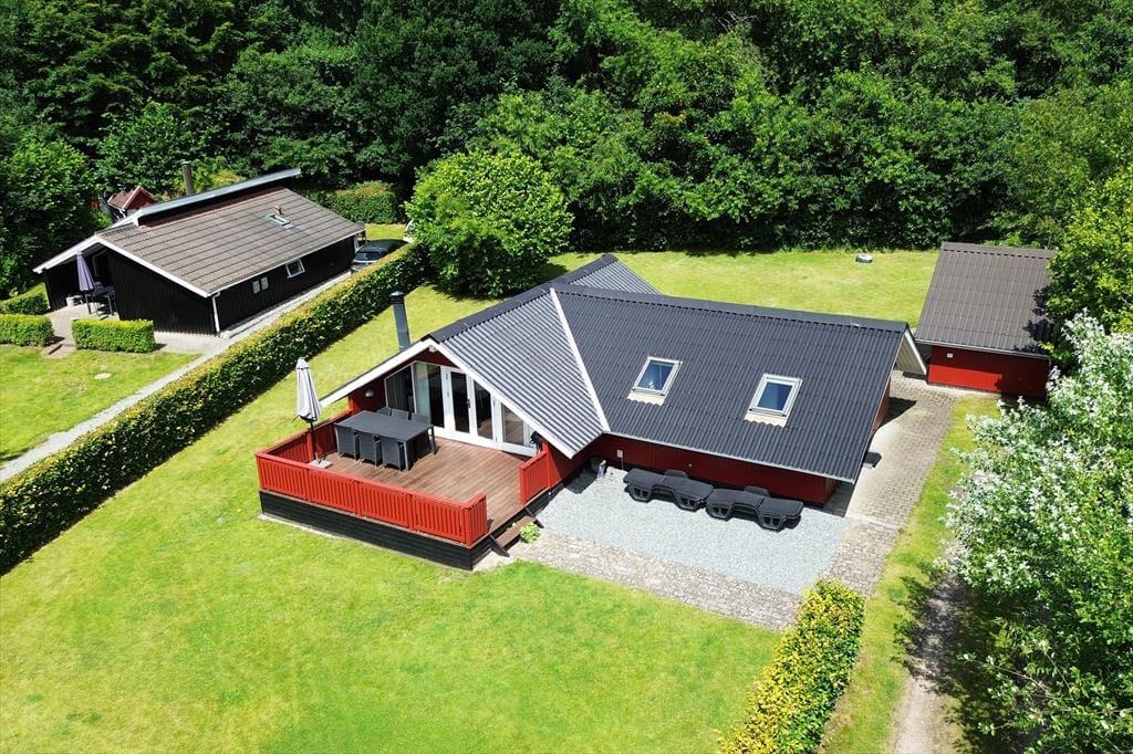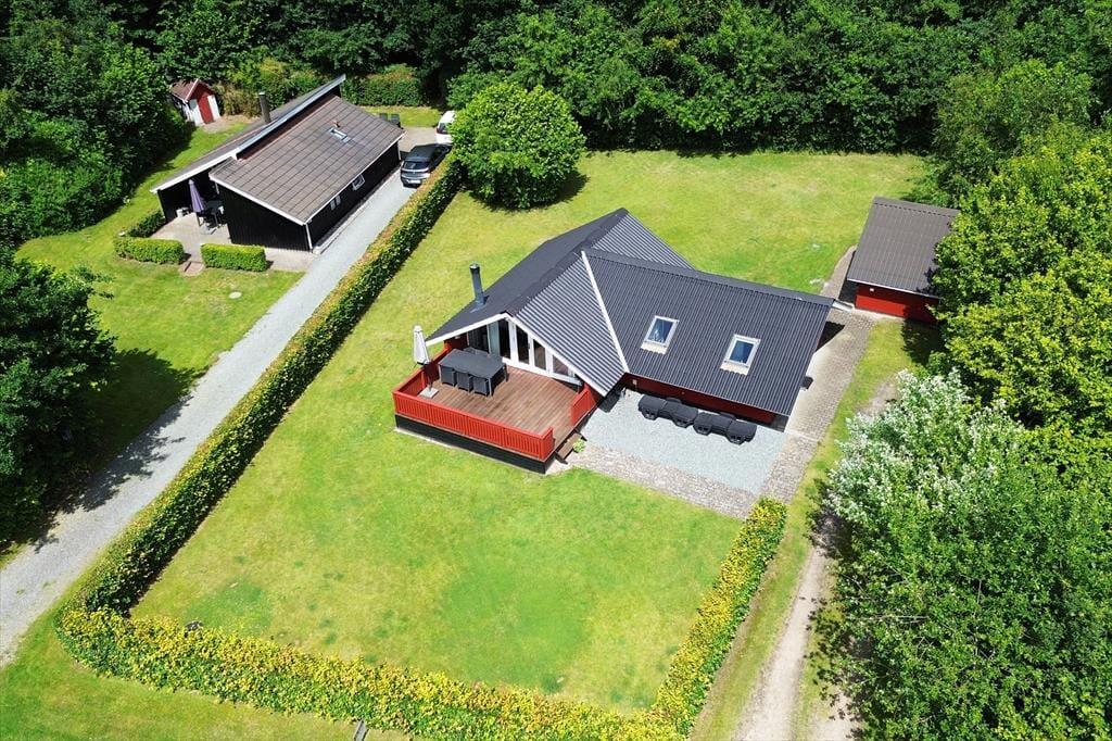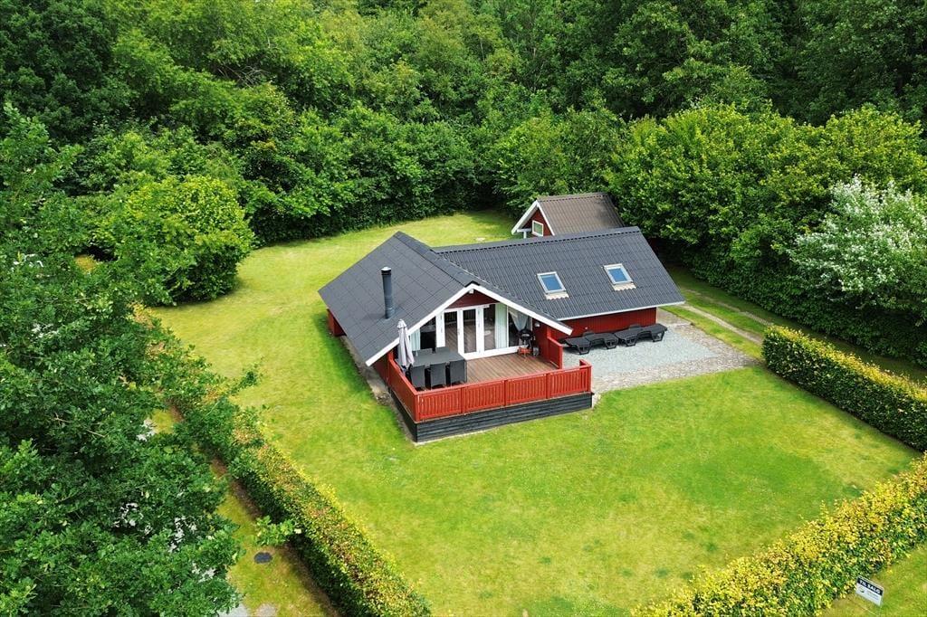Sommerhuset grønne grund byder på en dejlig græsplæne, der fint kan bruges som underlag, hvis I vil kaste med frisbee, lege fangeleg eller slå kolbøtter. I kan også bare slænge jer i græsset, mens I kigger op på de drivende skyer og lytter til fuglesangen fra det tilstødende skovstykke – den form for driverliv er der nemlig tid til, når det er ferie! En tilbagelænet stund på den sydvendte terrasse kan selvfølgelig også lade sig gøre, og hvis du vil forkæle familien med et friskgrillet måltid under åben himmel, er det også her, det kan foregå.