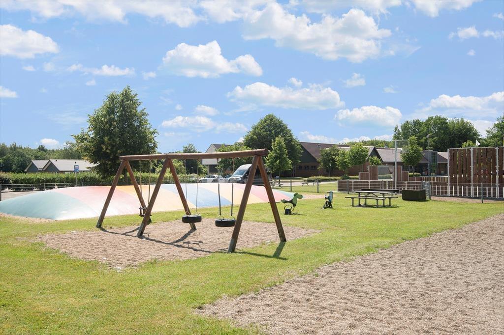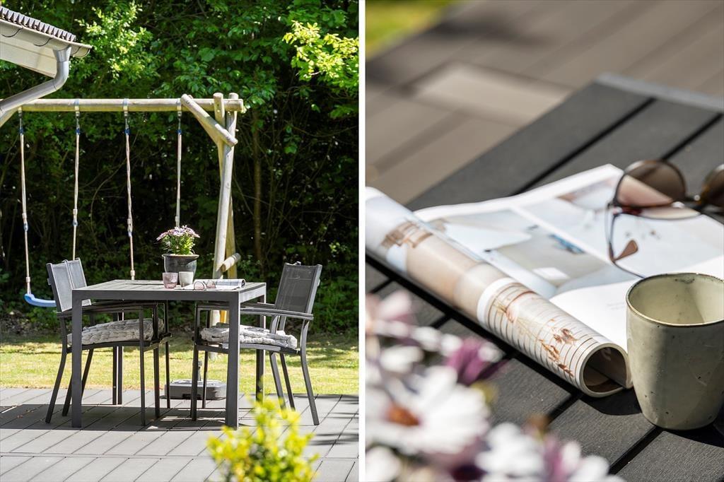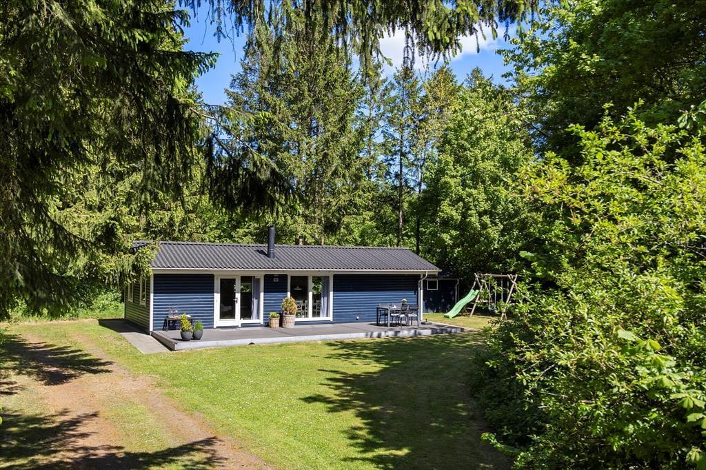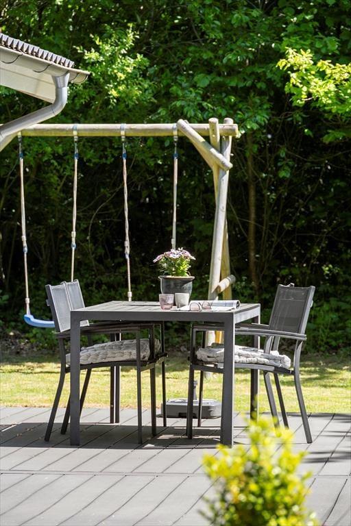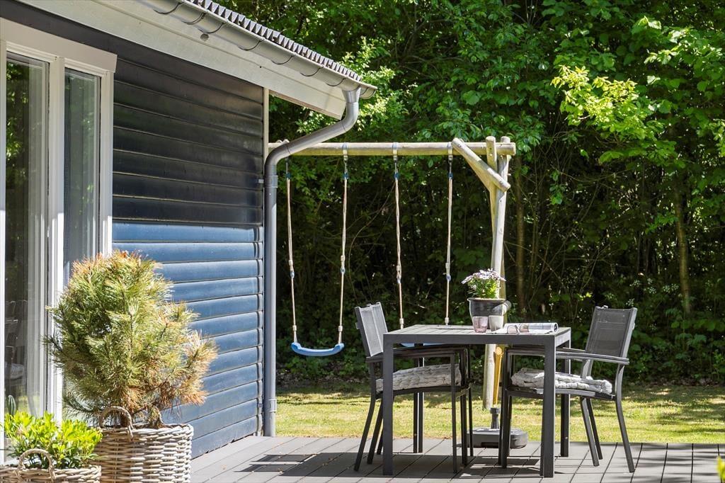 Udenfor venter en dejlig terrasse, hvor du kan starte dagen med morgenkaffe i solens stråler. Den store naturgrund giver masser af plads til leg og aktiviteter, og børnene kan frit udforske og lege i de grønne omgivelser. Her er der mulighed for at samle familien til hyggelige grillaftener eller bare slappe af med gode samtaler under stjernerne. Området indbyder til ro og fordybelse, hvor du kan lade naturens lyde og dufte fylde sanserne.