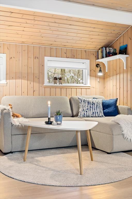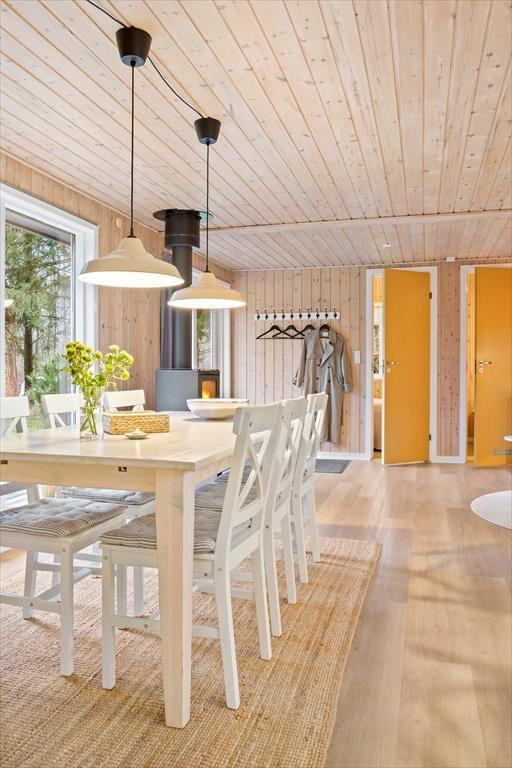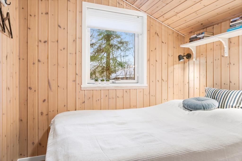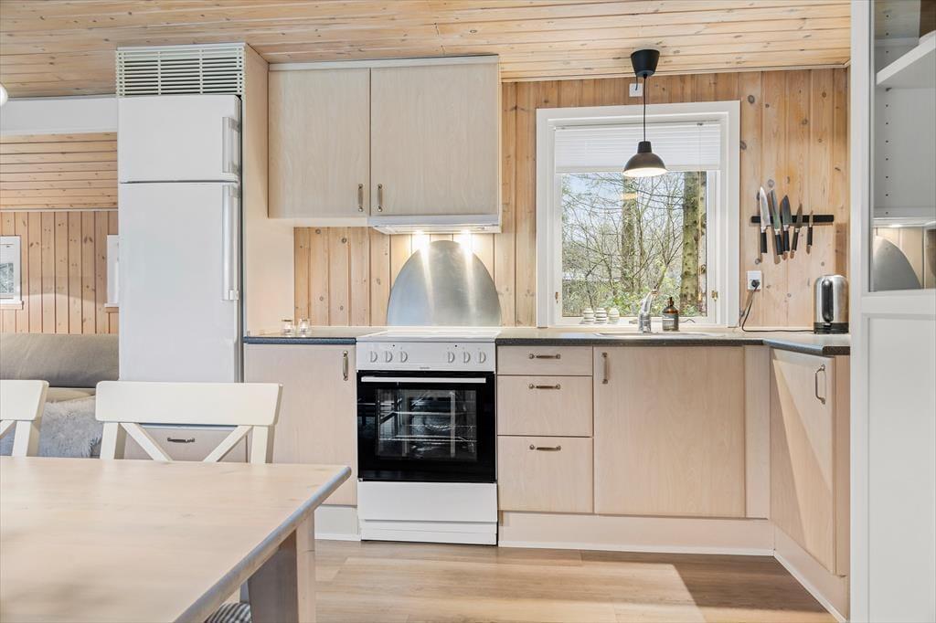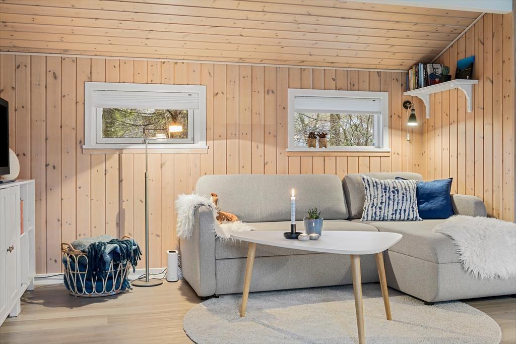 Når du træder ind i sommerhuset, bliver du mødt af en varm og indbydende stemning. De lyse rum skaber en lys og luftig atmosfære, og indretningen er gennemført med en behagelig stil. Her vil du straks føle dig hjemme og kunne smide fødderne op i de komfortable møbler, mens du nyder den hyggelige stemning. I stuen kan du slappe af med en god bog nær brændeovnen og lade flammerne skabe en intim atmosfære. Det åbne køkken inviterer til samvær, hvor du kan forberede lækre måltider og nyde dem sammen med dine nærmeste omkring spisebordet. Den gennemtænkte indretning giver dig masser af plads til at slappe af og finde ro.