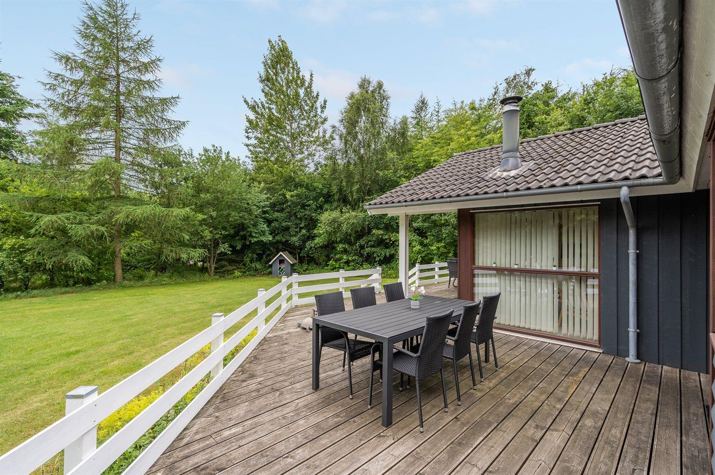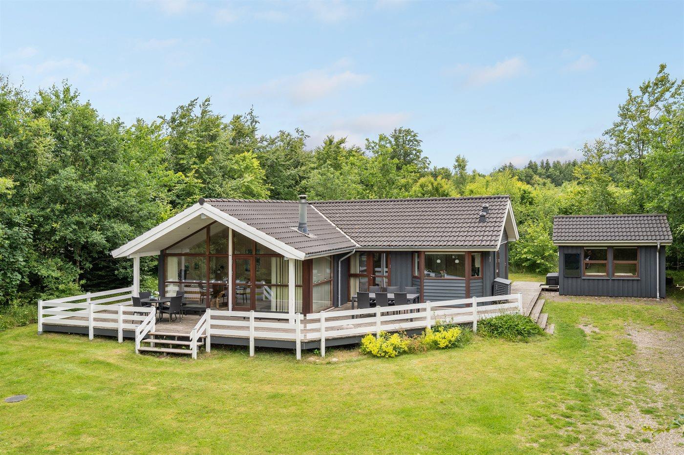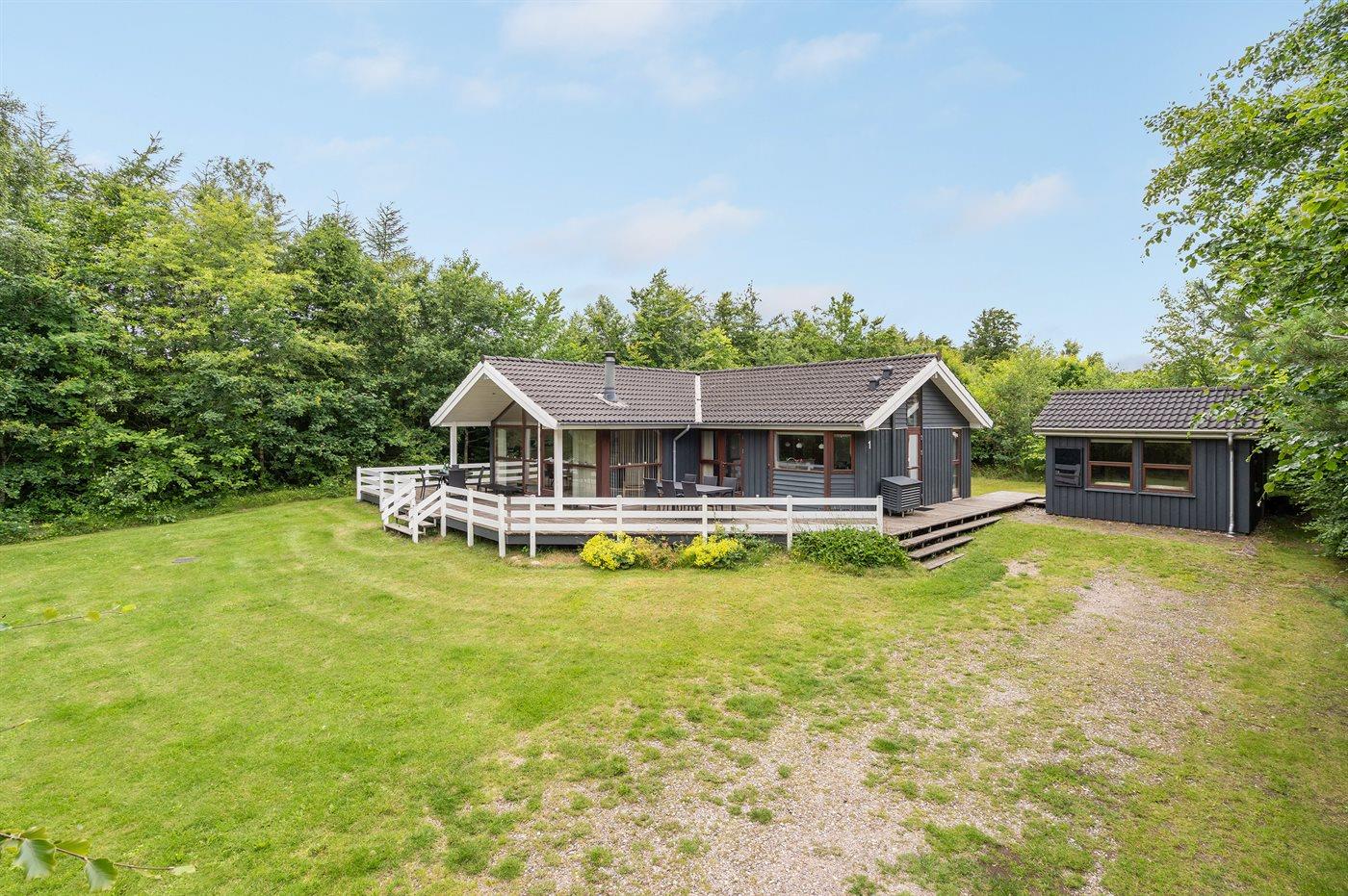 Flot og velindrettet sommerhus beliggende på en dejlig lukket grund i rolige og naturskønne omgivelser nær skov og plantage.