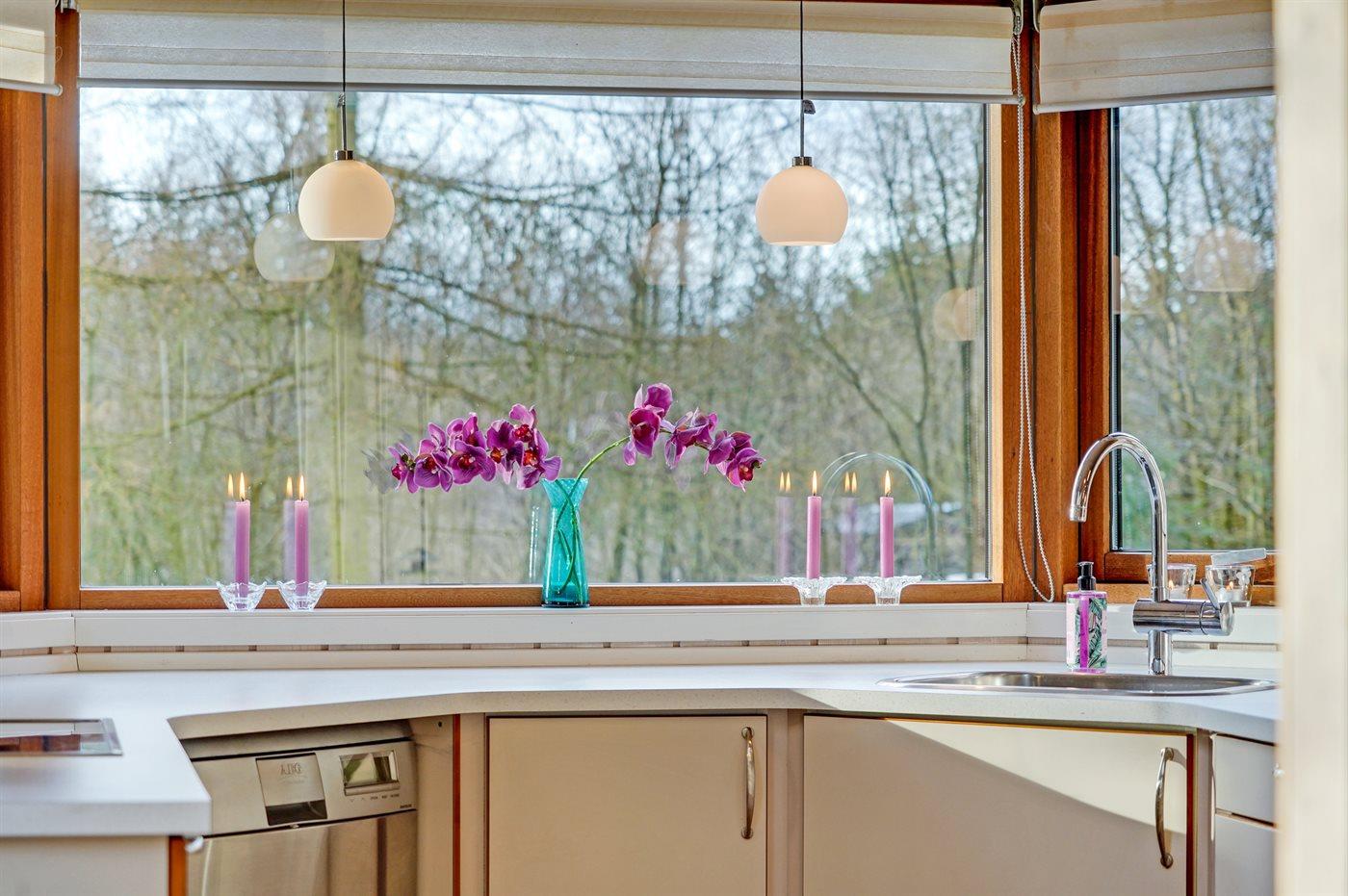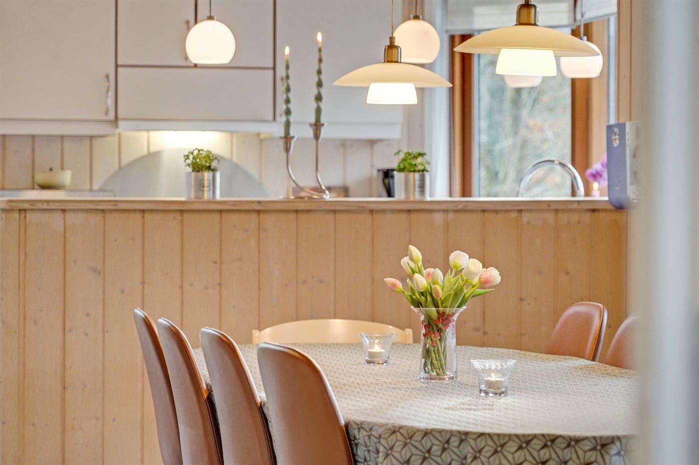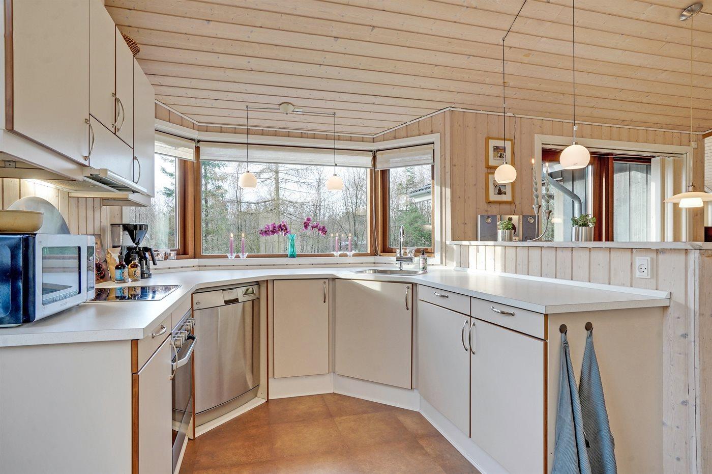 Køkkenet er udstyret med 1 køleskab. Der er 4 keramiske kogeplader, varmluftovn, mikrobølgeovn samt opvaskemaskine.