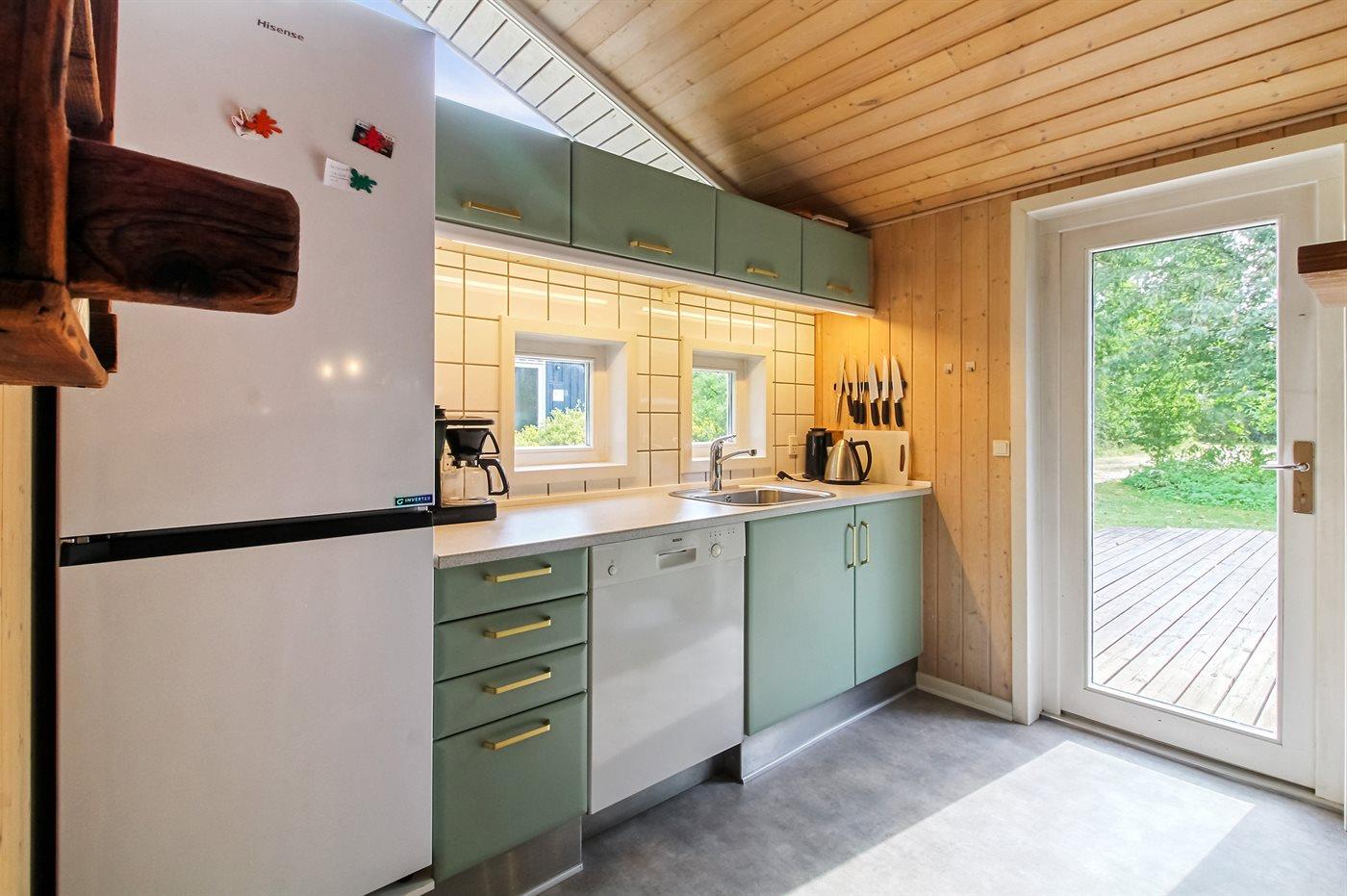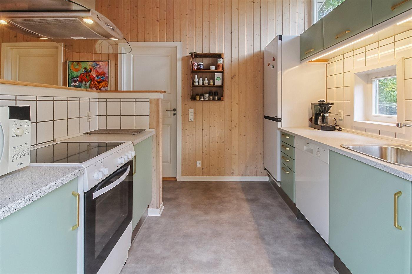 Køkkenet er udstyret med 1 køleskab. Der er 4 keramiske kogeplader, varmluftovn, mikrobølgeovn samt opvaskemaskine.