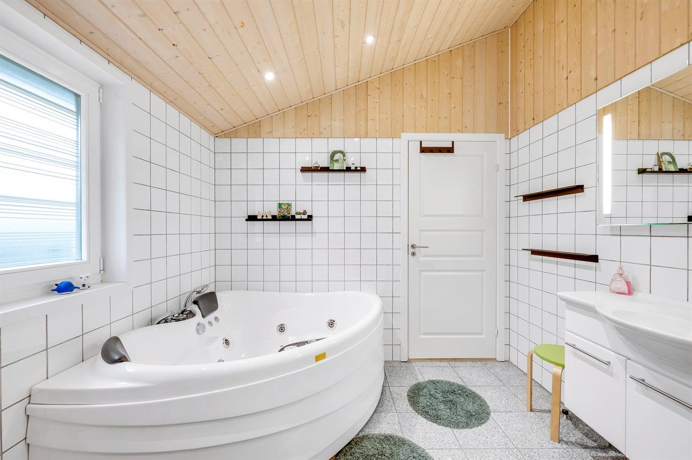 Der er 2 badeværelser med bruseniche og 2 toiletter. Der er gulvvarme på 2 badeværelser. I saunaen er der mulighed for afslapning.