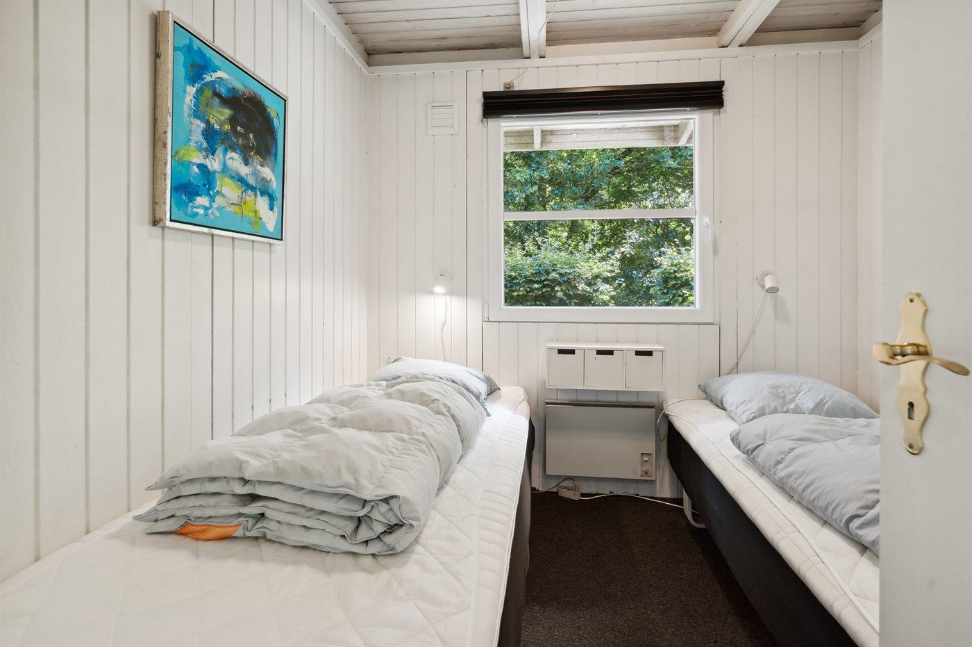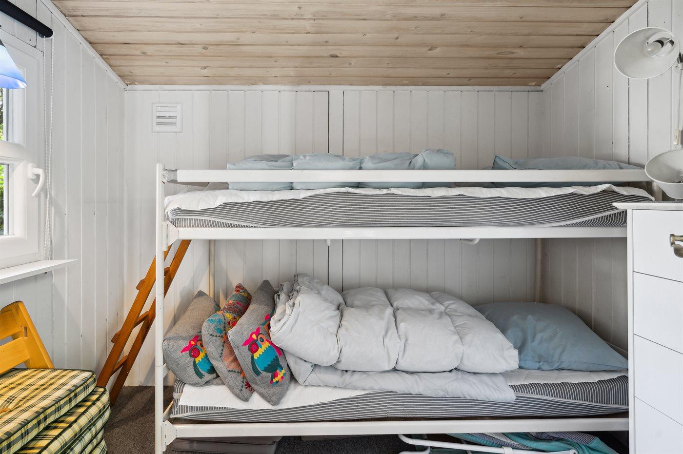Der er i alt 3 soveværelser. Sovepladserne fordeler sig på: 2 sovepladser i dobbeltseng. 2 sovepladser i enkeltsenge. 2 sovepladser i køjeseng. Derudover er der 1 stk. barneseng.