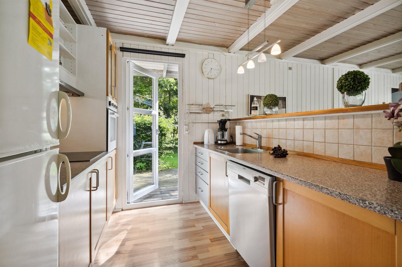 Køkkenet er udstyret med 1 køleskab. Der er 4 elkogeplader, bageovn, mikrobølgeovn samt opvaskemaskine.
