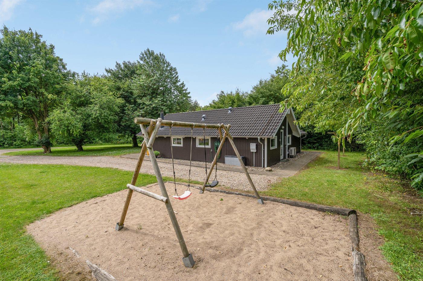Dette hyggelige sommerhus ligger på en dejlig stor grund, hvor der er god plads til at såvel børnene som hunden kan boltre sig. Huset ligger i et område med gode fiskemuligheder og 2 golfbaner – så tag fiskestangen med til den nærliggende fiskesø eller nyd en sommerdag på golfbanen. Bemærk, at fryseren står i udhuset.