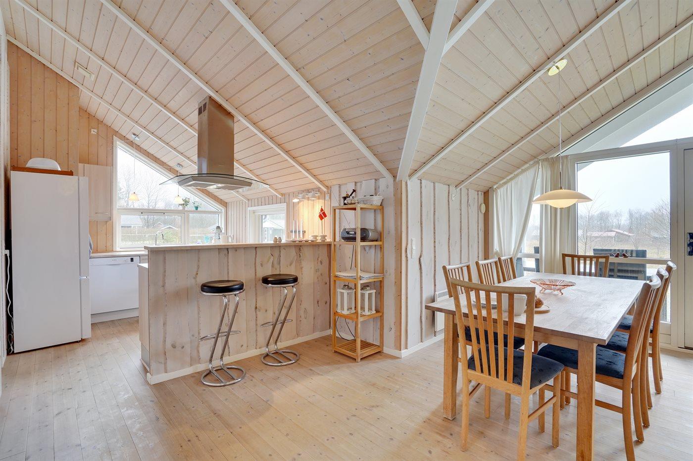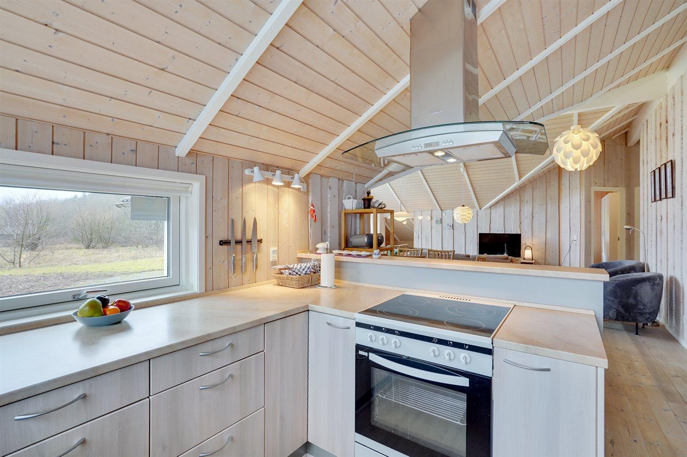 Køkkenet er udstyret med 1 køleskab. Der er 4 keramiske kogeplader, varmluftovn samt opvaskemaskine.