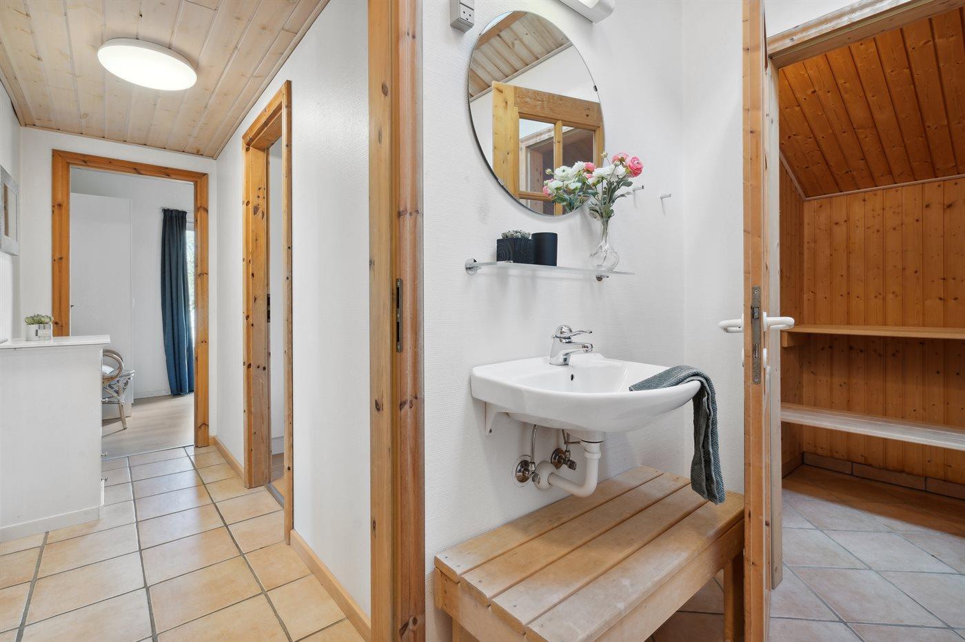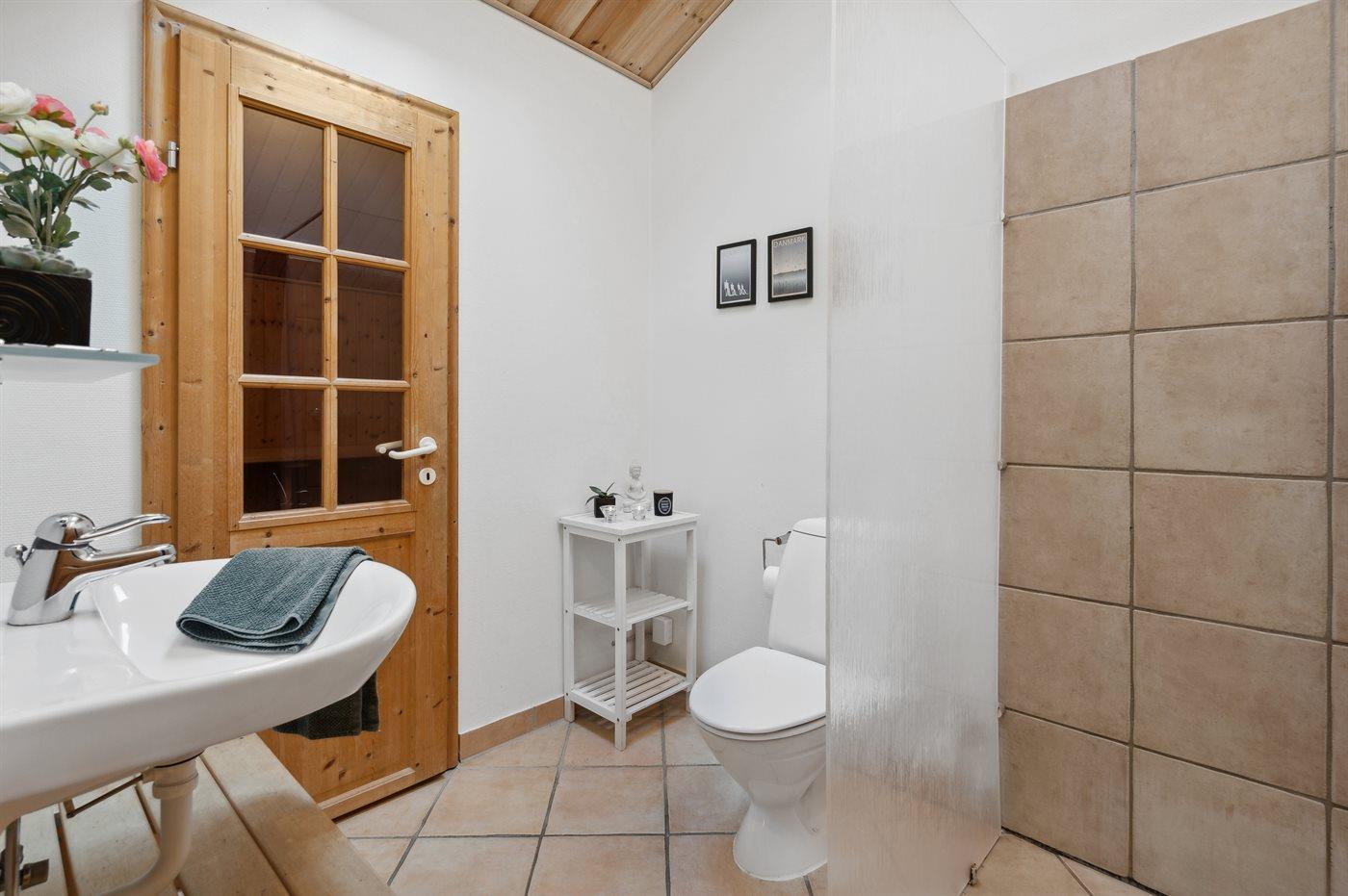 Der er 2 badeværelser med bruser og 2 toiletter. Der er gulvvarme på 2 badeværelser. I saunaen er der mulighed for afslapning.